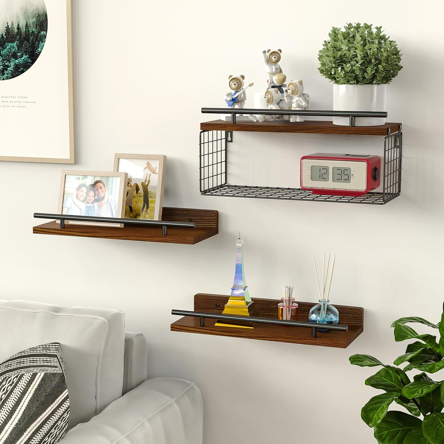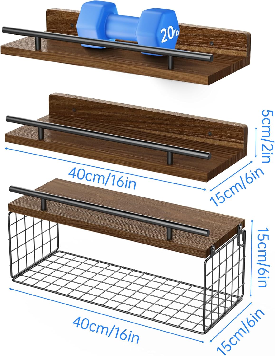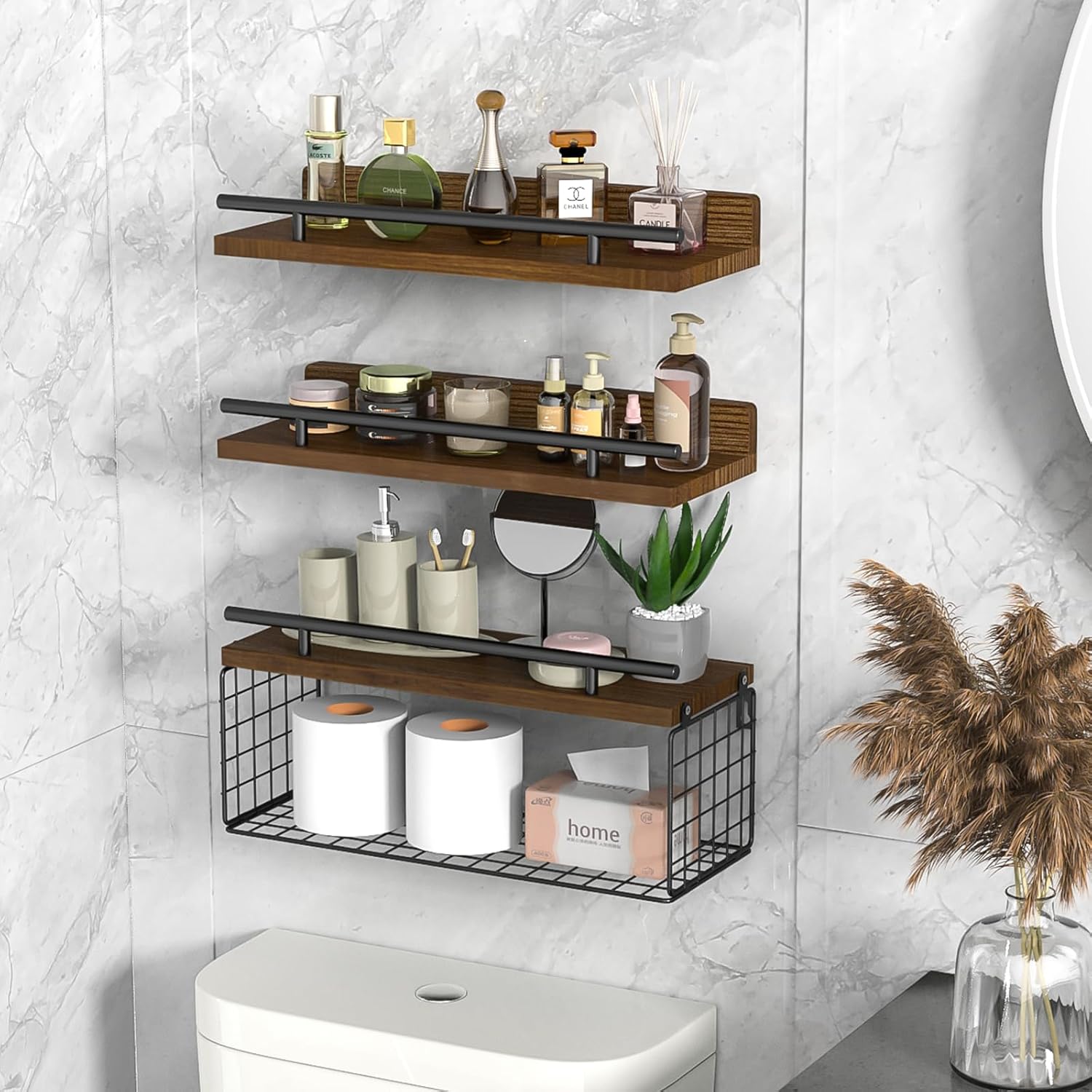 NiHome 3-Tier Floating Shelves with Storage Basket, Rustic Wood Bathroom Shelves Over Toilet with 3 Metal Guardrails, Wall Mounted Floating Shelves for Bathroom, Bedroom, Living Room, Kitchen, Office