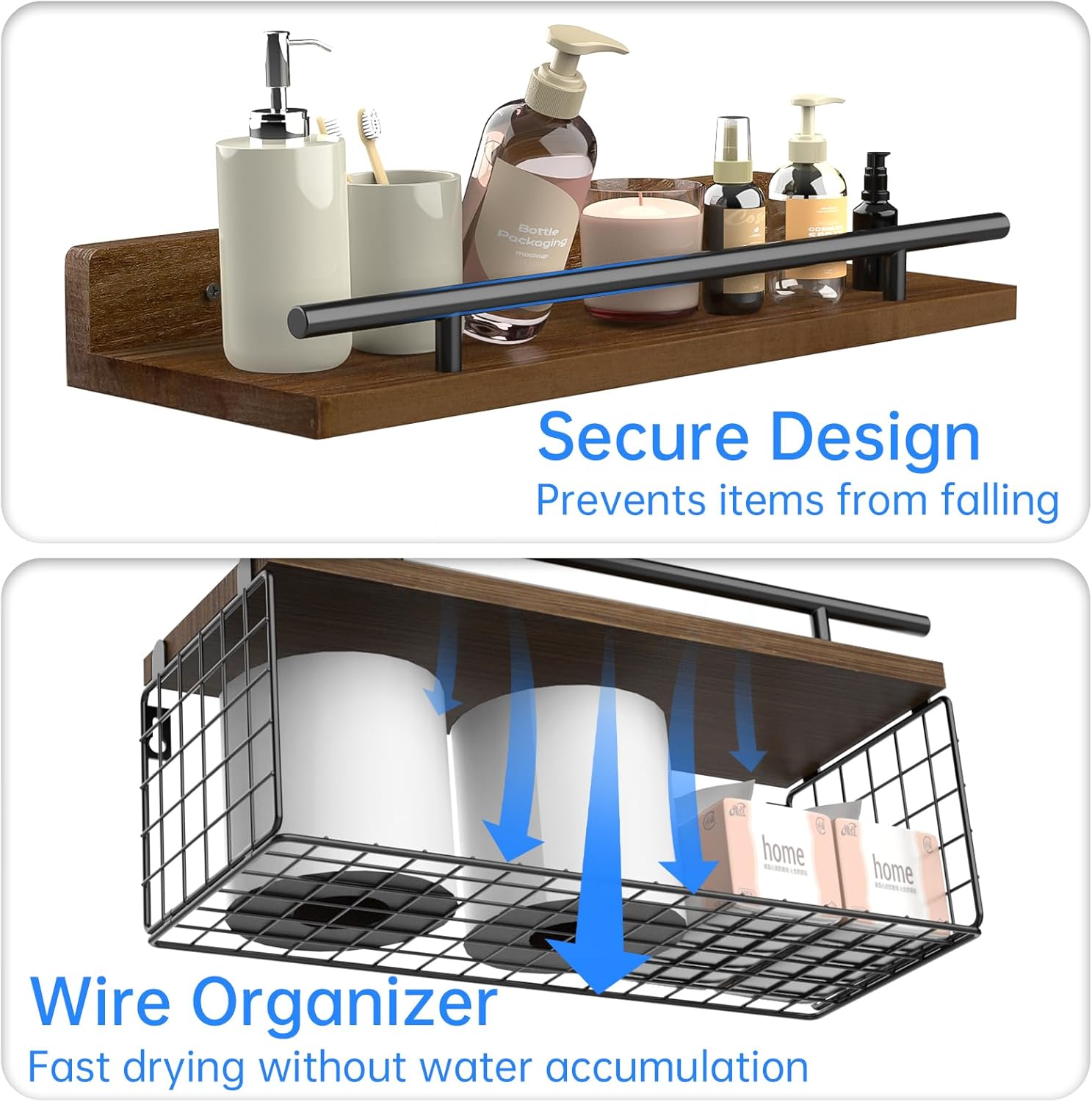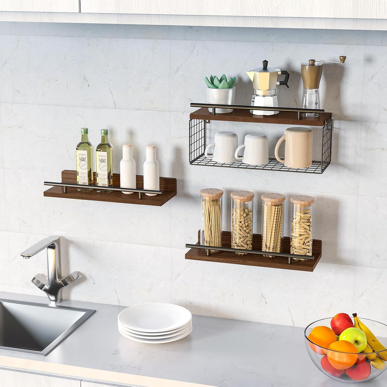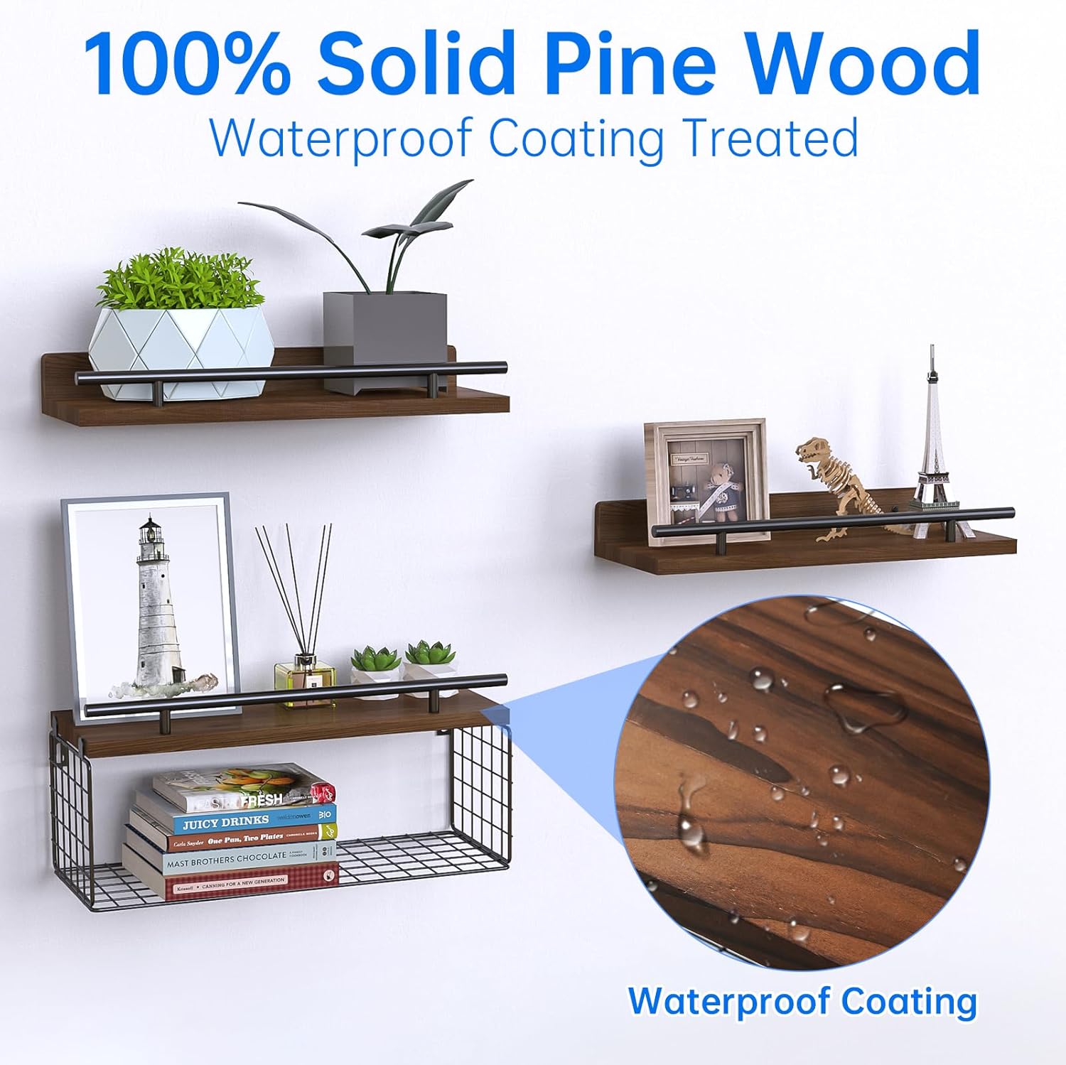 NiHome 3-Tier Floating Shelves with Storage Basket, Rustic Wood Bathroom Shelves Over Toilet with 3 Metal Guardrails, Wall Mounted Floating Shelves for Bathroom, Bedroom, Living Room, Kitchen, Office