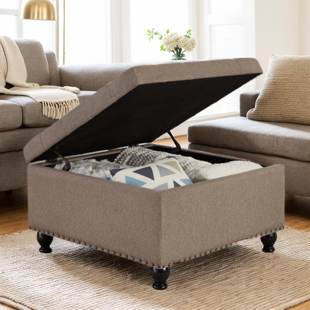 Large Square Storage Ottoman with Wood Legs, Storage Ottoman Footrest and Seat Cube, Upholstered Button Tufted Coffee Table with Nail Trims for Living Room, Entryway, or Bedroom, Linen