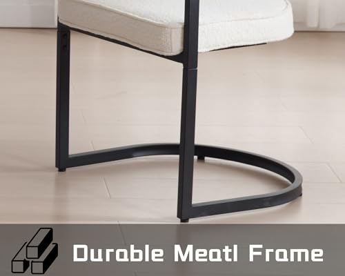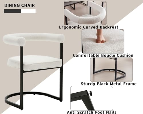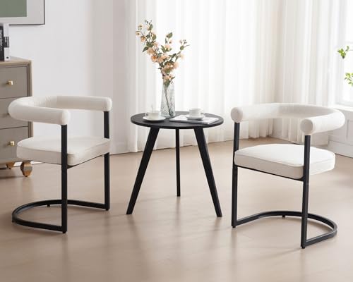 Modern Barrel Dining Chairs Set of 2, White Boucle Dining Chairs with Black Metal Frame Sherpa Upholstered Dining Room Chairs with Round Arms, Accent Kitchen Arm Chairs for Living Room/Bedroom/Office