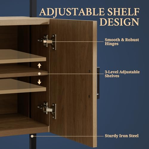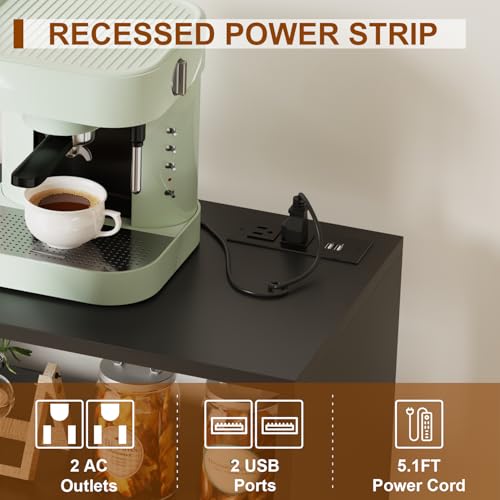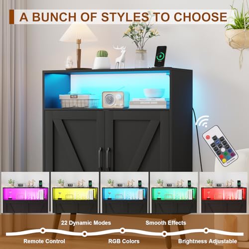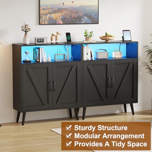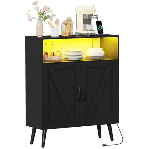 Sideboard Buffet Cabinet with led Light and Charging Station, 38.6" Tall Storage Cabinet with 2 Doors, Farmhouse Accent Cabinet for Kitchen, Hallway, Living Room, Black
