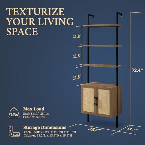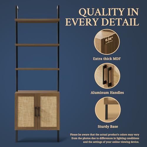 Ladder 5 Tier Bookshelf with Rattan Cabinet, 73" Tall Bookshelf with Oak Wood Storage,Wall Mount Bookshelves with Steel Frame Plant Display for Living Room, 2 Pack (Weathered Oak)