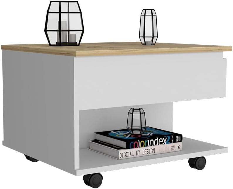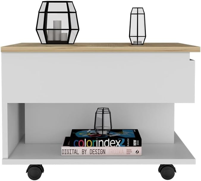 Lift Top Coffee Table Mercuri, Casters, White/Light Oak Finish