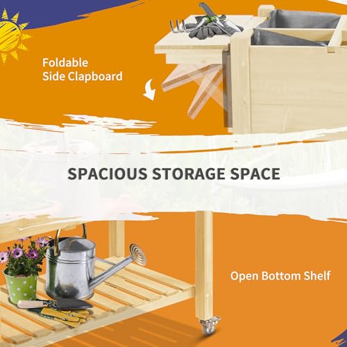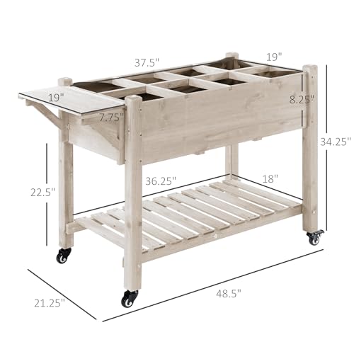 Outsunny Raised Garden Bed with 8 Grow Grids, Wooden Outdoor Plant Box Stand with Folding Side Table and Wheels, 49" x 21" x 34", for Vegetables, Flowers, Herbs, Natural