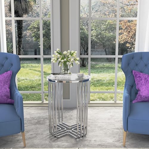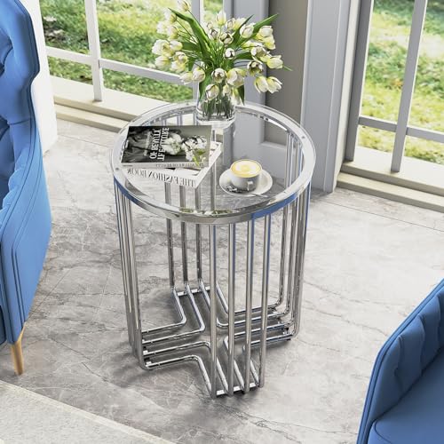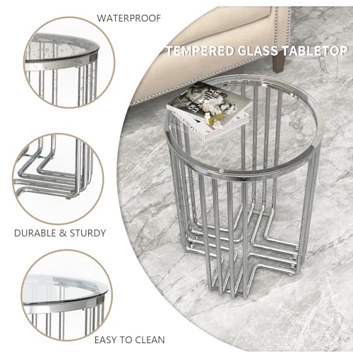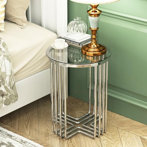 Silver Side Table, Modern Round End Tables for Living Room Office Small Spaces, Glass End Table with Metal Frames, Nightstand for Bedroom, Bedside Furniture, Easy Assembly