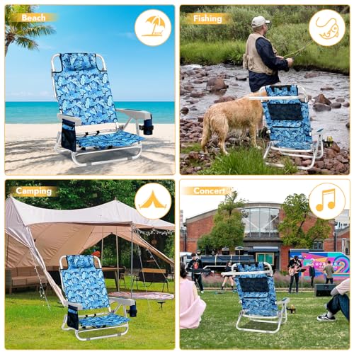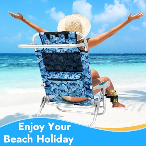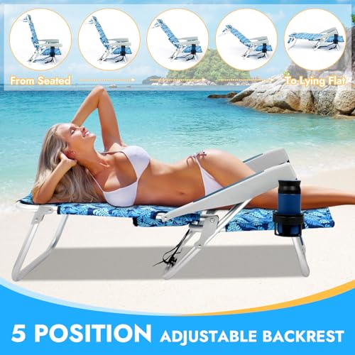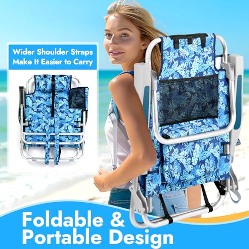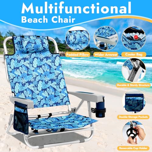 Folding Beach Chair Backpack for Adults, 5 Positions Adjustable Beach Chairs Heavy Duty Beach Seat Foldable with Large Cooler Pouch and Cup Holder Pocket, Up to 350 LBS Support