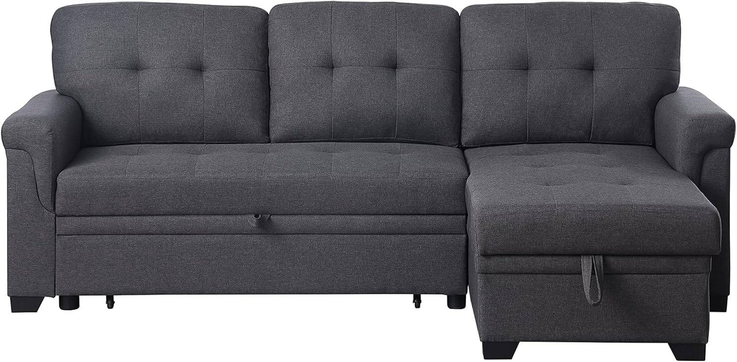 84'' Living Room L-Shape Convertible Sleeper Sectional Sofa with Storage Chaise and Pull-Out Bed, Linen Upholstered Reversible Corner 3 Person Couch, for Apartment, Dark Gray, 84 Inch
