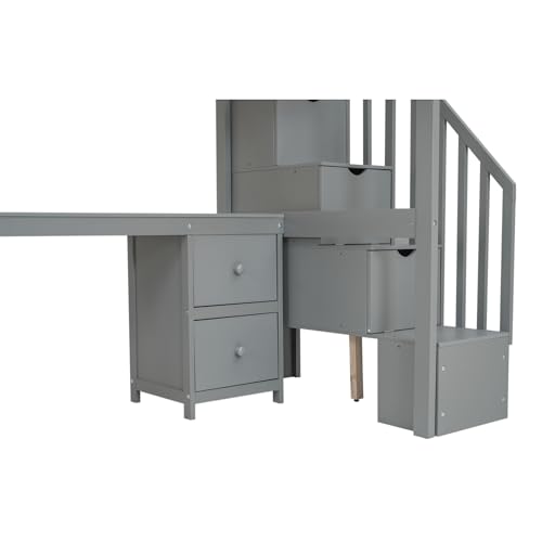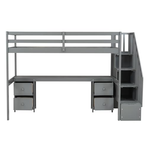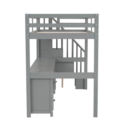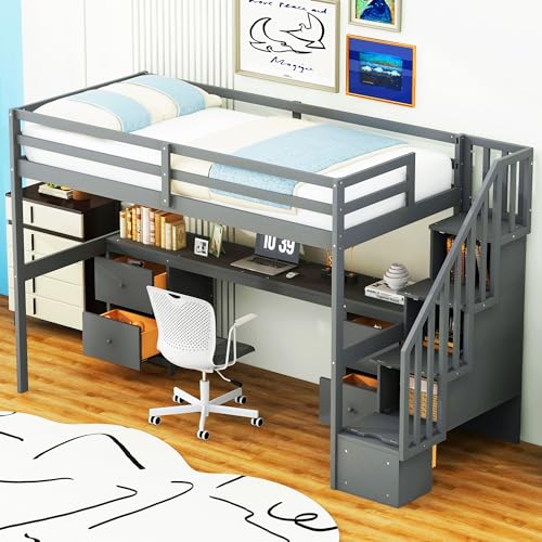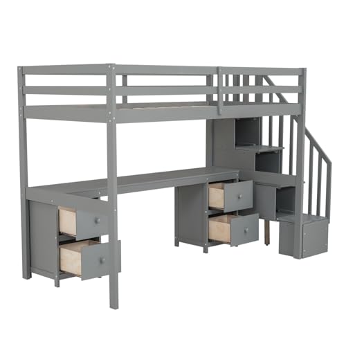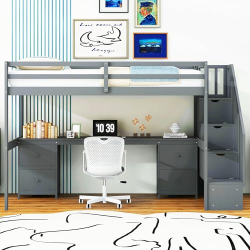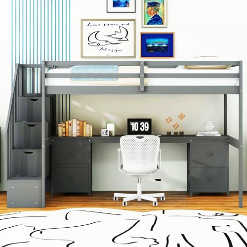 Modern Wooden Twin Size Loft Bed Frame with Built-in Desk and Double Storage Drawers,for Kids Teens Adults Bedroom Use (White@Desk1, Twin)