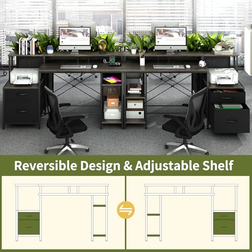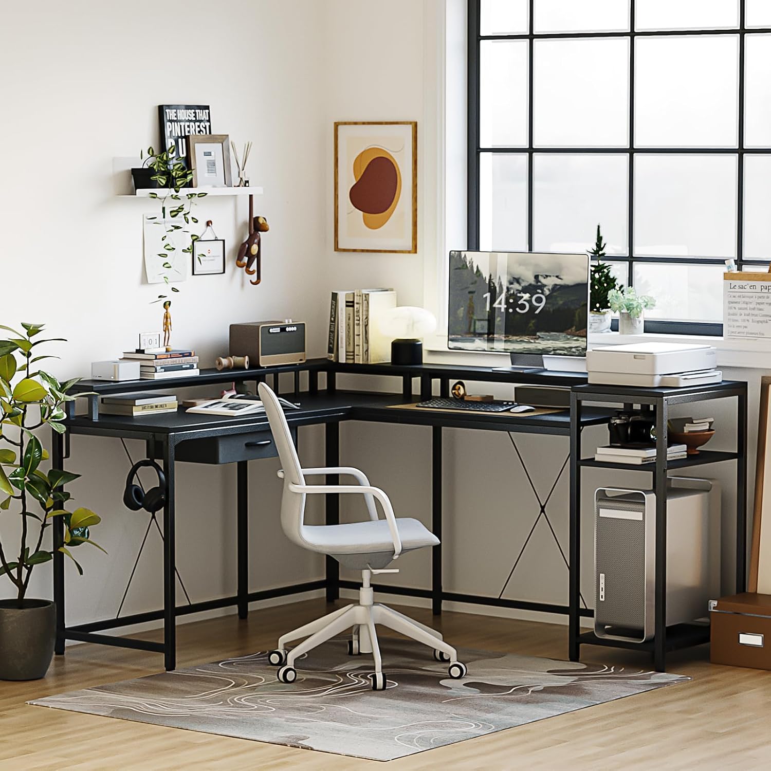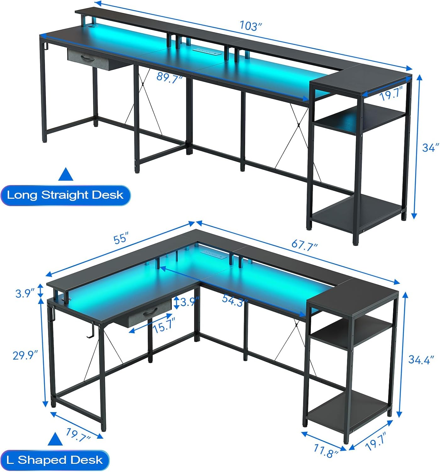 GAOMON L Gaming Desk, 68" Home Office Desk with File Drawer & Power Outlet, LED Lights, Computer Corner Desk with Monitor Shelf and Hook, Two Person Desk, Black