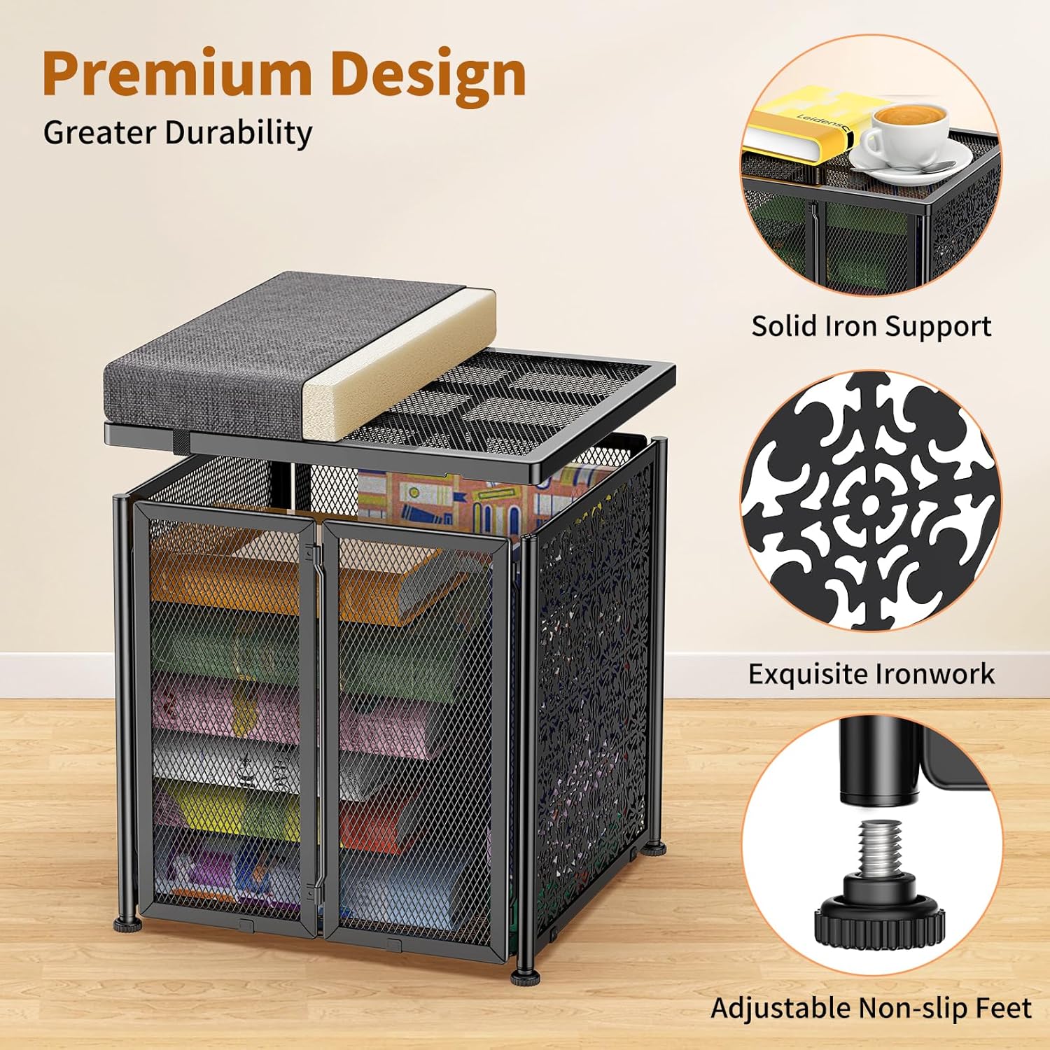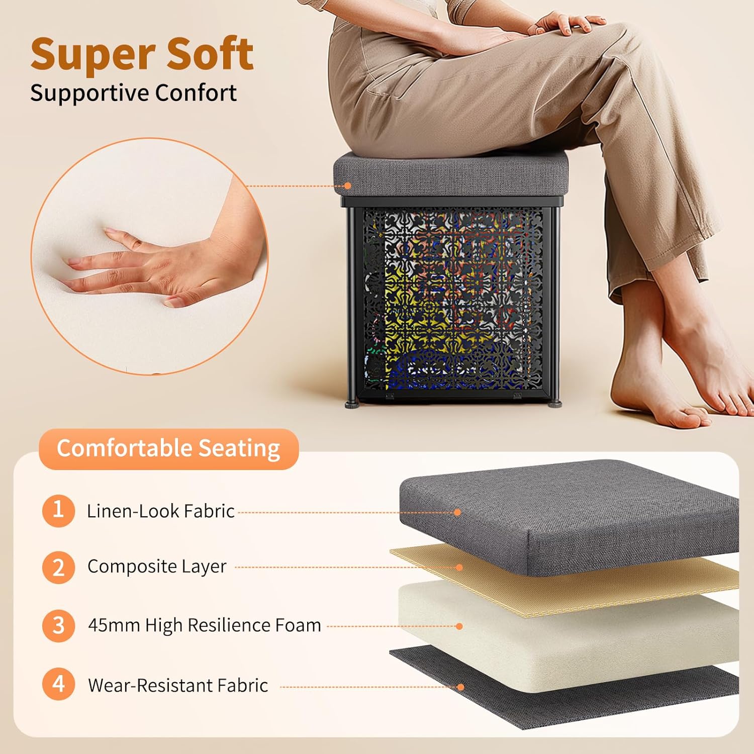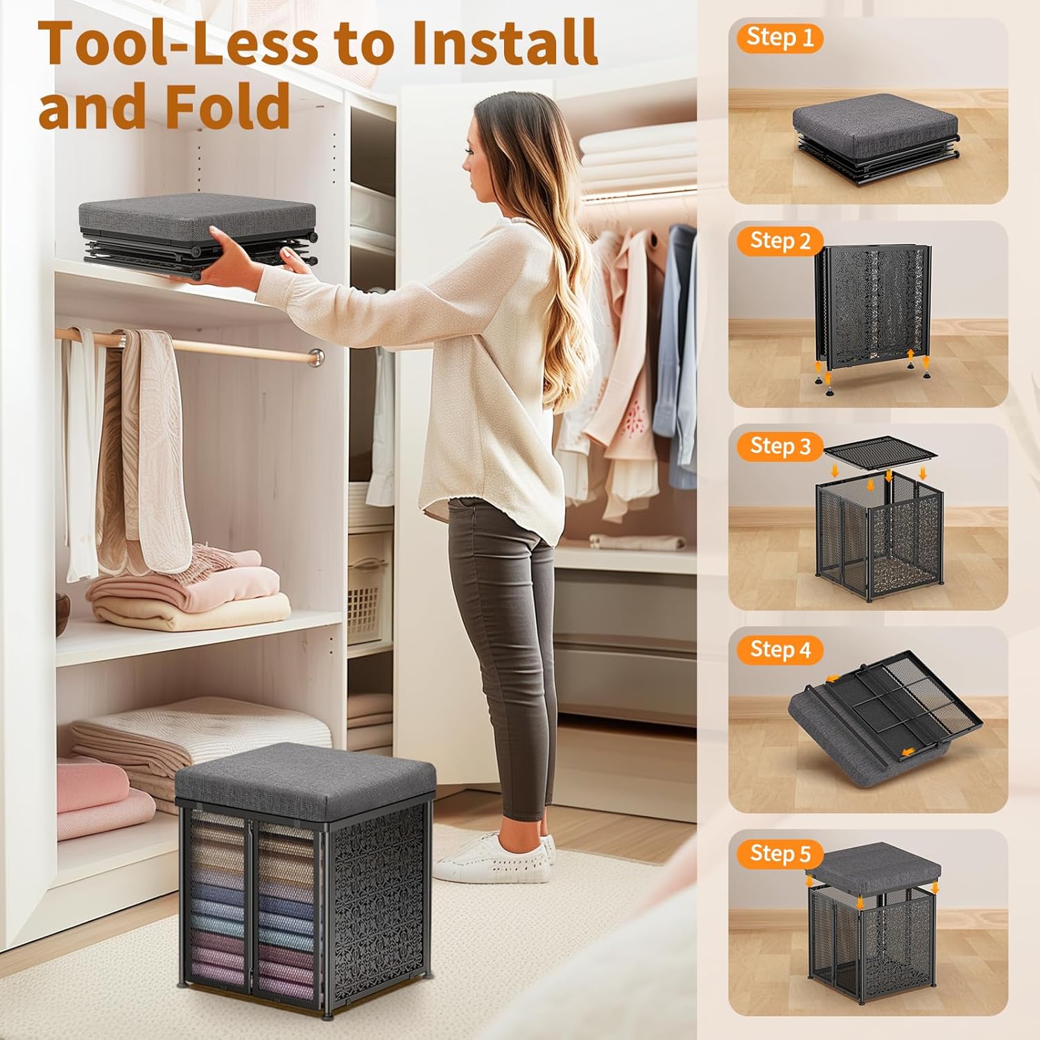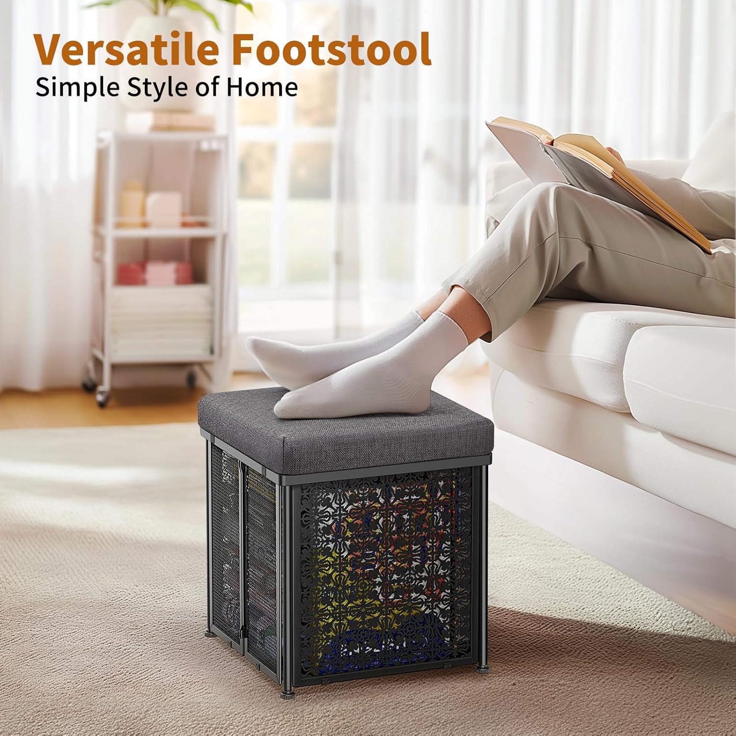 Storage Ottaman Foot Rest, 15.7 Inchs Folding Storage Ottoman Cube, Small Linen Ottaman with Storage, Steel Frame, Loads Up to 600 lb, for Living Room, Bedroom, Black