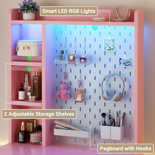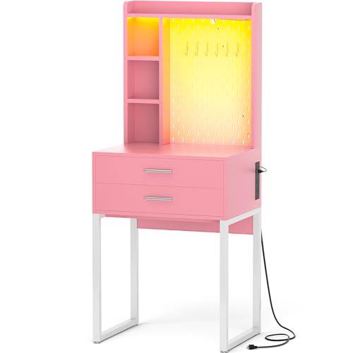Small Vanity Desk with Hutch and Drawers, Pink Makeup Vanity Desk with Charging Station, Vanity Table Dressing Table with LED Lights, Vanity Desk No Mirror with Pegboard for Girls Women, 24"