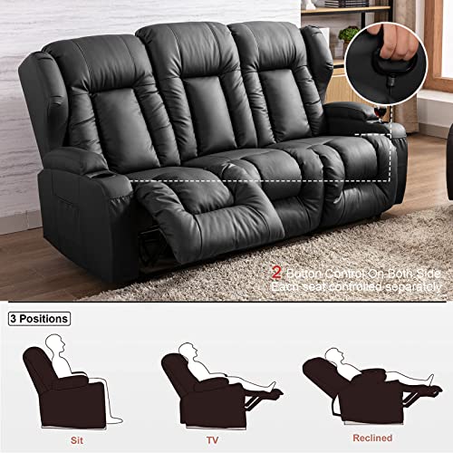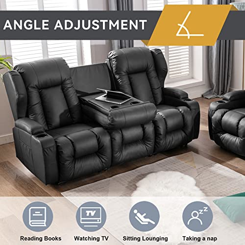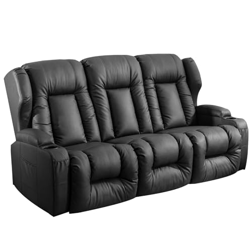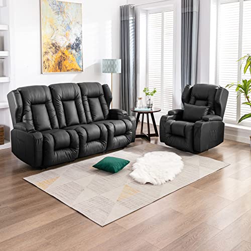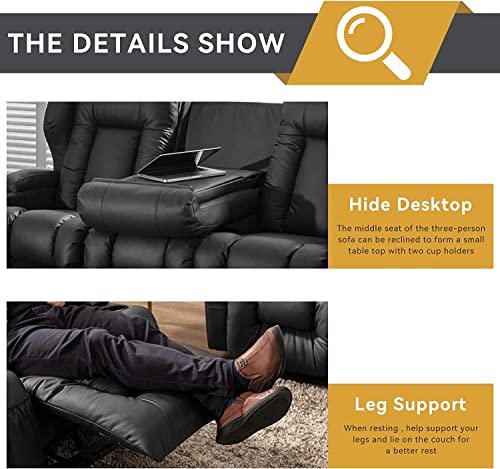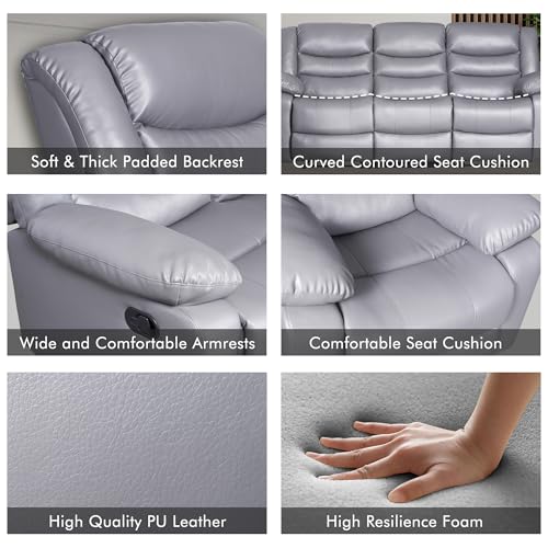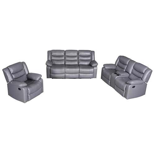 Recliner Sofa Set, Faux Leather Manual Reclining Couch Set, 3 Piece Recliner Set with Loveseat, Console & Cup Holders, Living Room/Office/Theater Seating (Grey)