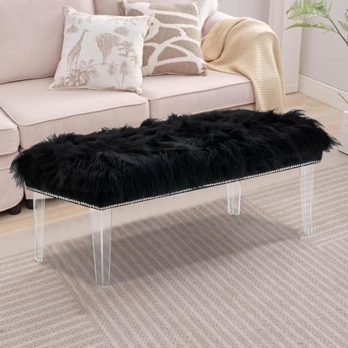 Modern Black Faux Fur Ottoman Bench - Upholstered Furry Bench with Acrylic Legs for Bedroom, Living Room, Entryway, Vanity or Bed End