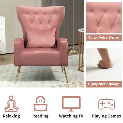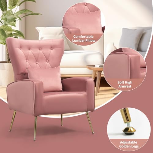 Button-Tufted Living Room Chairs Set of 2, WingBack Velvet Accent Chair Armchair with Lumbar Pillow, Bedroom Chairs Vanity Chair Arm Chair with Golden Legs, Yellow