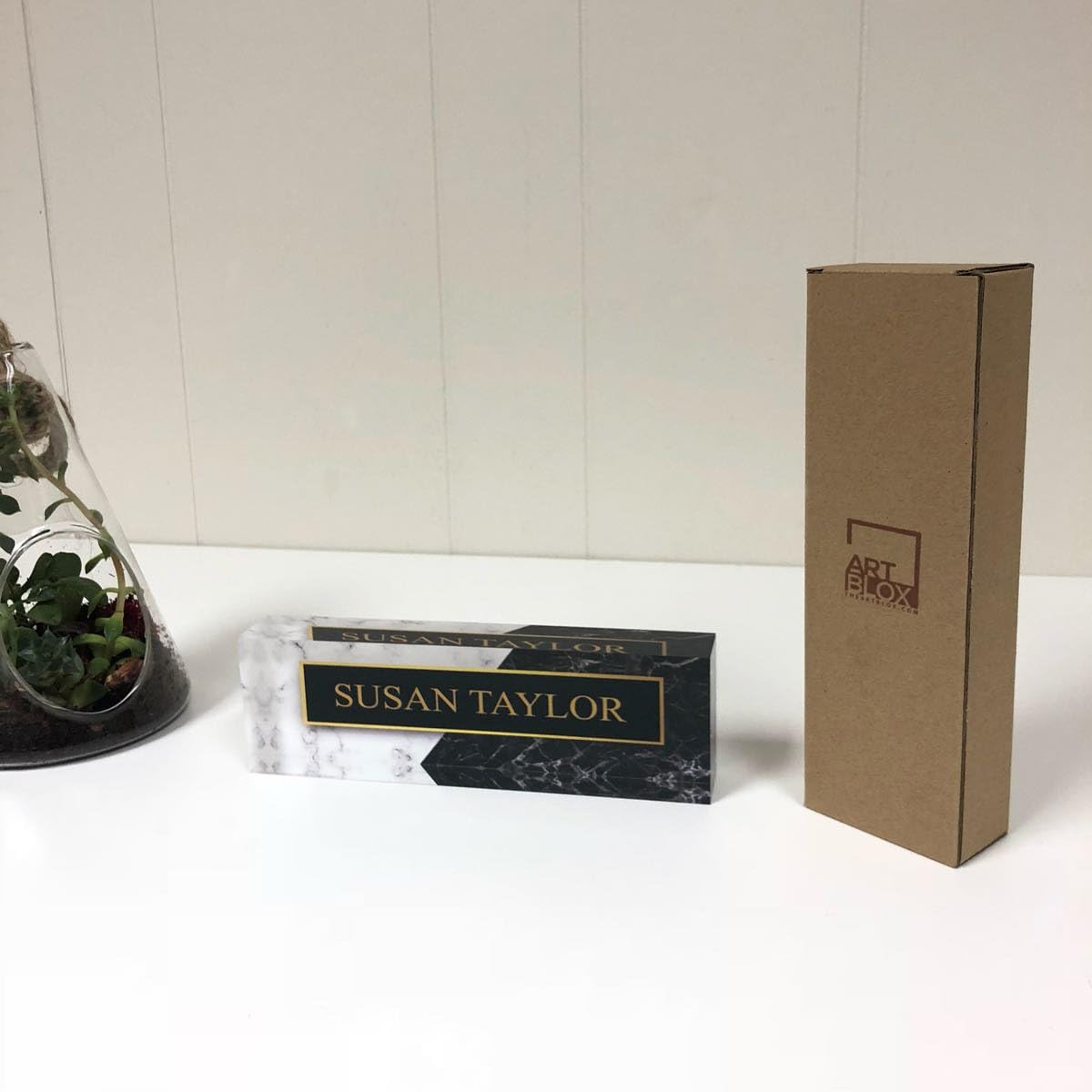 Artblox Personalized Name Plate for Desk | Black & White Marble Design On Clear Acrylic Glass | Custom Desk Name Plate Personalized Name and Credentials for Teacher Phd Military Office Name Plate