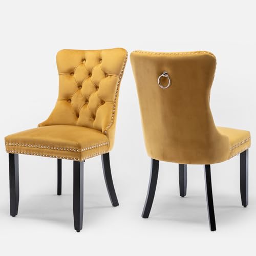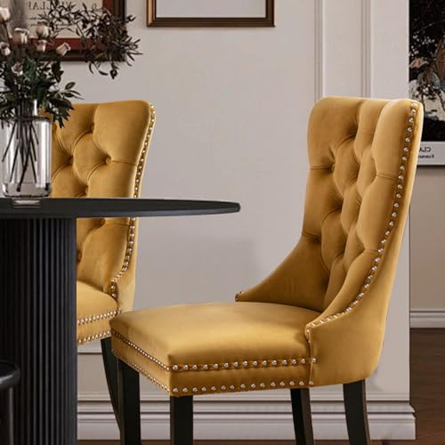 Velvet Upholstered Dining Chairs Set of 6, Modern Style Kitchen Side Chairs with Nailhead Trim and Wood Legs,Metal Pulling Ring for Dining Room Living Room(Quadrangular Star&Black)
