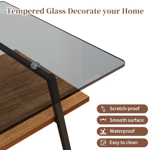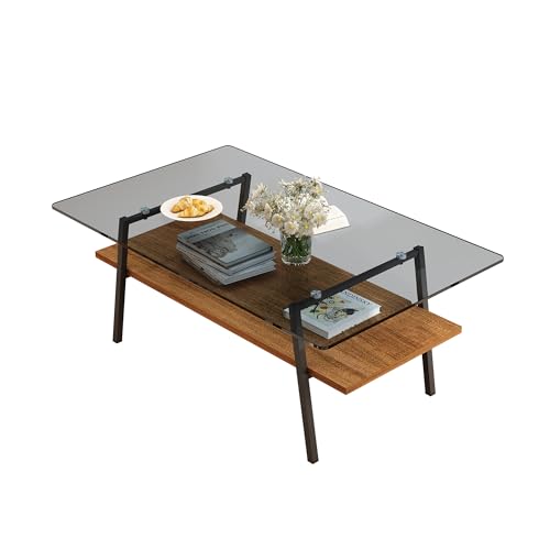 Tempered Glass Coffee Table,38.58" Living Room Rectangle Coffee Table, 2-Tier Coffee Tables Grey Glass Top and White Wood Shelf White Metal Legs,Center Table for Home Office