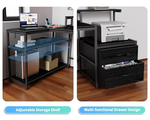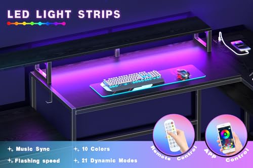L Shaped Gaming Desk with Drawes,Computer Desk with Led Lights & Power Outlets, Reversible Home Office Desk with Shelves White