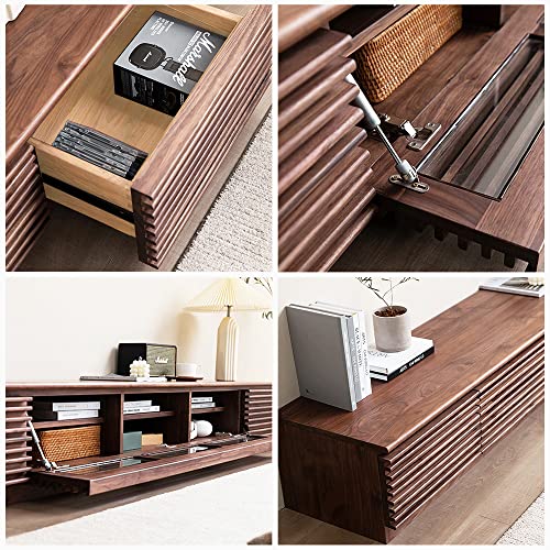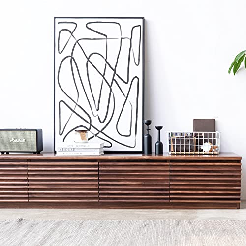 POVISON Wood Media Console, 86'' Mid-century Modern TV Stand with Storage, Assembly-Free Large Slatted TV Console for up to 85 Inches TV, Customized Compartments & Solid Pinewood Drawer