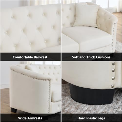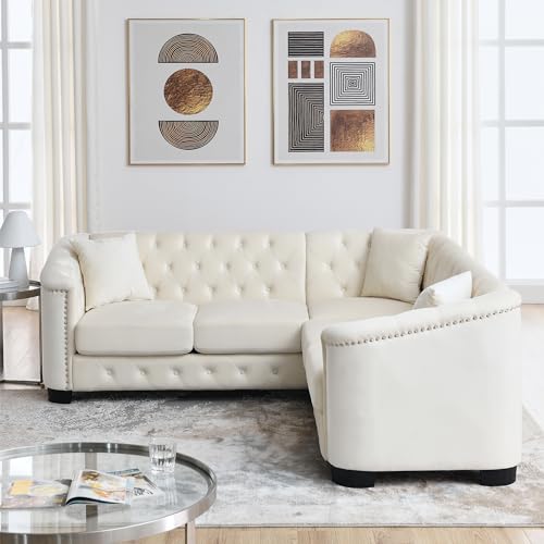 mikibama 82 Inch Modern Chesterfield Velvet Corner Sofa, L Shaped Sectional Couch, 5 Seater Nail Head Decor Upholstered Tufted Sofas with 3 Pillows for Living Room, Apartment, Office(Grey)