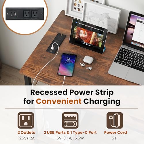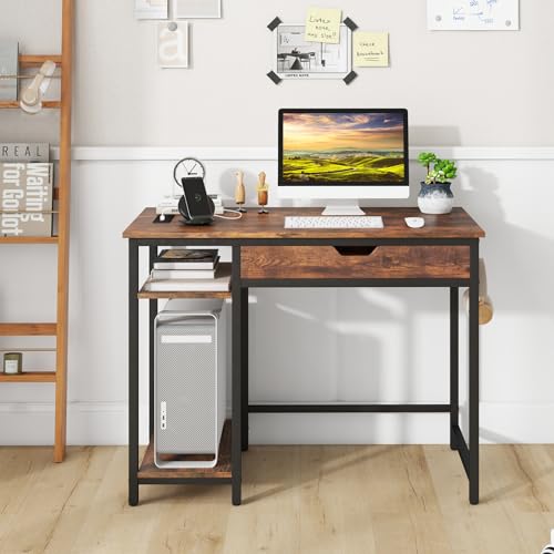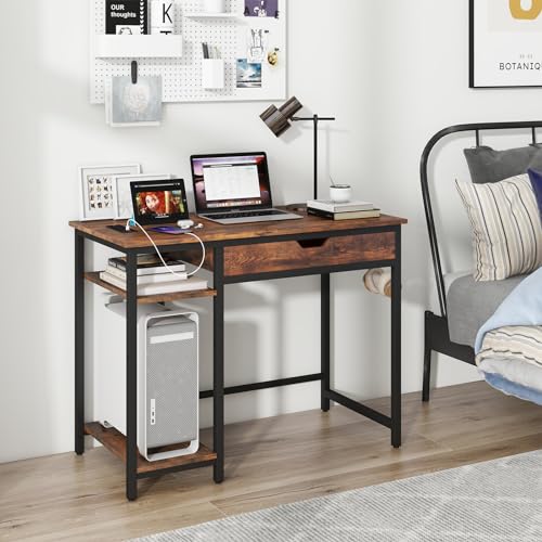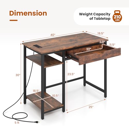 Tangkula Computer Desk with Charging Station, 40” Industrial Home Office Desk with Drawer & Adjustable Shelf, Compact Computer Workstation with CPU Stand & Headphone Hooks, Study Writing Desk