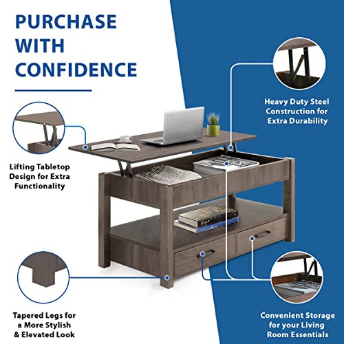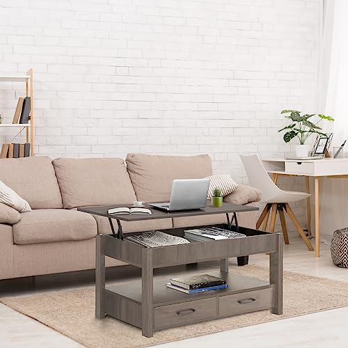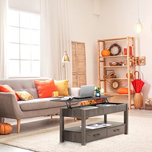 Lift Top Coffee Table with Hidden Compartment & 2 Storage Shelves - Living Room Dining Table with Rising Tabletop Lifttop Desk for Apartment, Home, Condo - GREY
