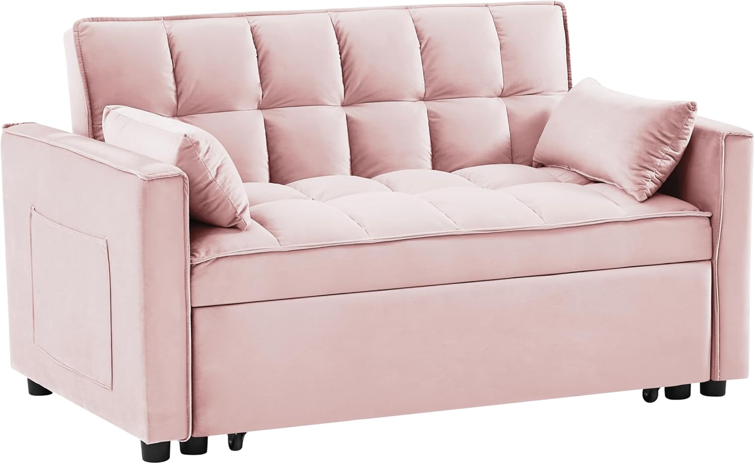 3 in 1 Convertible Pull Out Couch Bed Velvet Upholstered Futon Loveseat Sofa with Adjustable Backrest, Storage Pockets, Toss Pillows , Pullout Sofabed Sofacama for Living Room Office RV Small Places