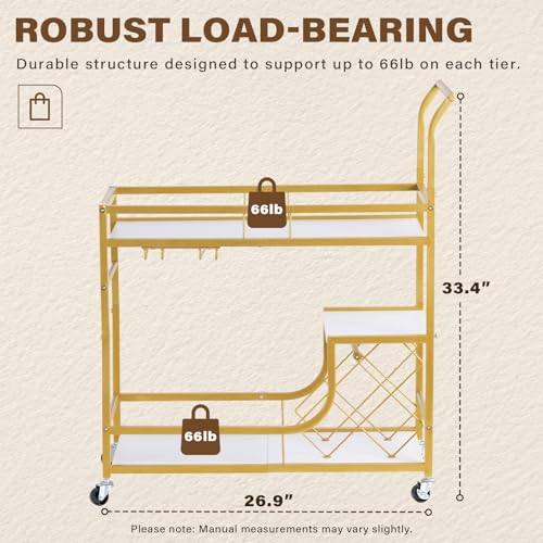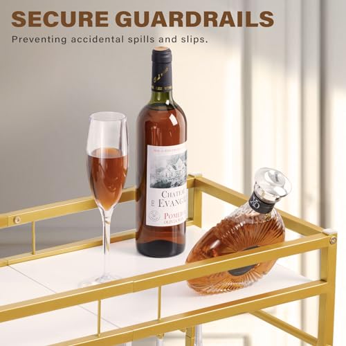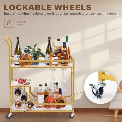 Bar Cart, Bar Serving Cart with Wheels, 2 Tier Bar Carts for The Home Kitchen Dining Room with Wine Rack and Glass Holder (Gold)