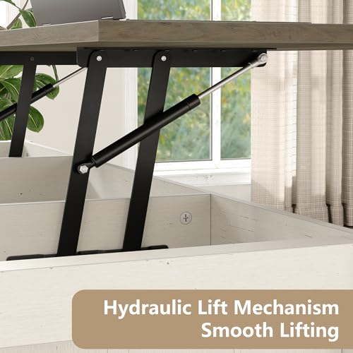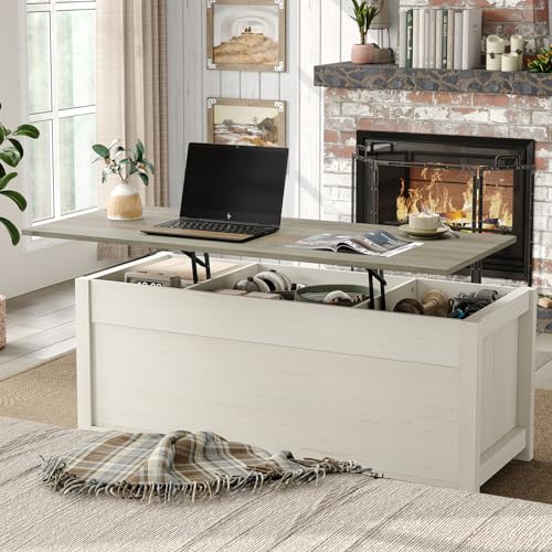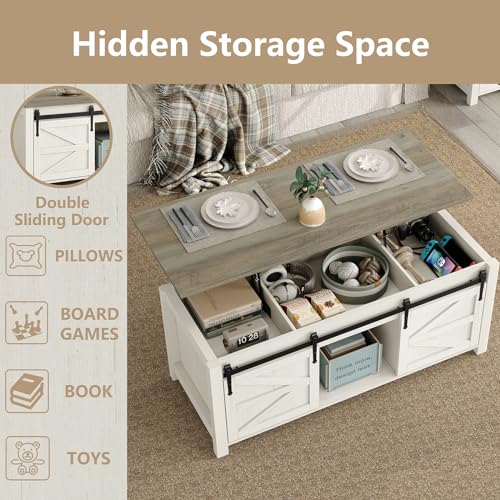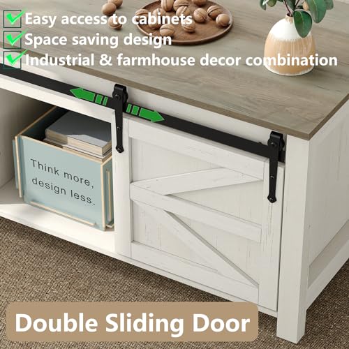 Lift Top Coffee Table with Storage, 47.3'' White Farmhouse Center Table with Sliding Ironmesh Doors, Rustic Brown Top Rectangular Coffee Table for Living Room