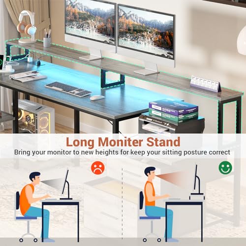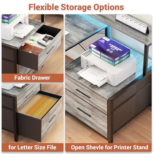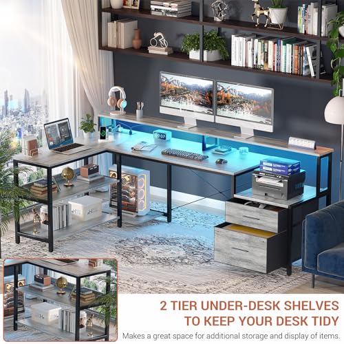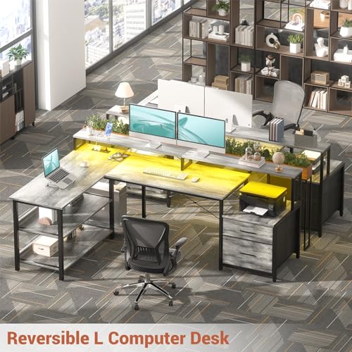 Aheaplus L Shaped Desk with Power Outlet, Reversible L Shaped Computer Desk with File Drawer & Monitor Stand, Gaming Desk with LED Strip, Home Office Desk Corner Desk with Storage Shelf, White Oak