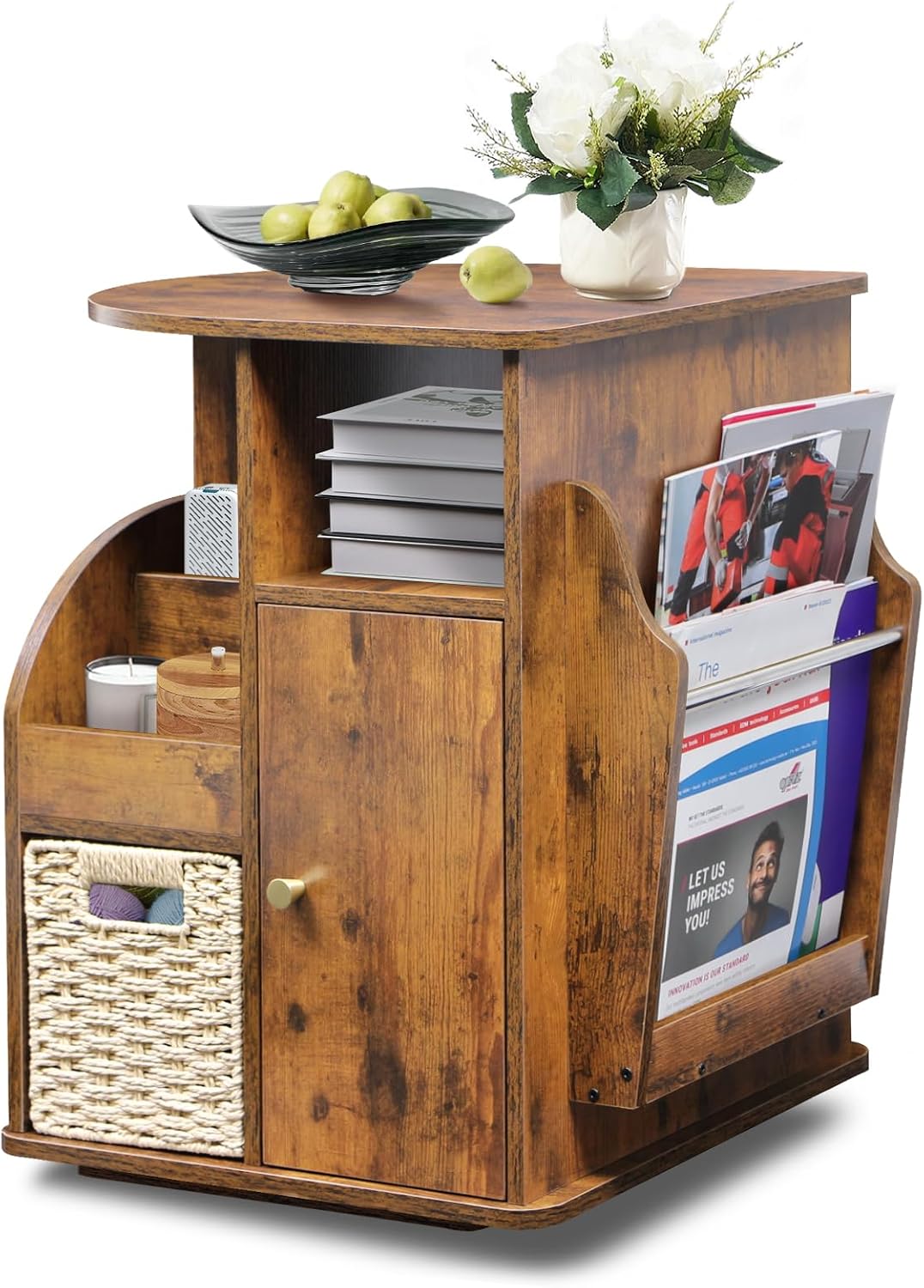 TooCust Rotating Side Tables Living Room,Multi Storage End Table with Magazine Rack,Basket and Cabinet,Sofa Side Farmhouse End Tables with Open Shelf,Revolving Night Stand for Bedroom (Rustic Brown).
