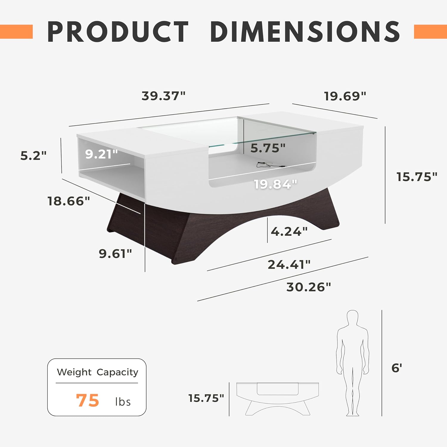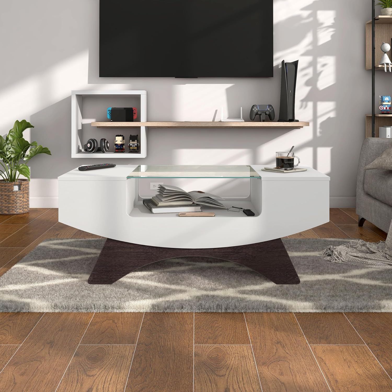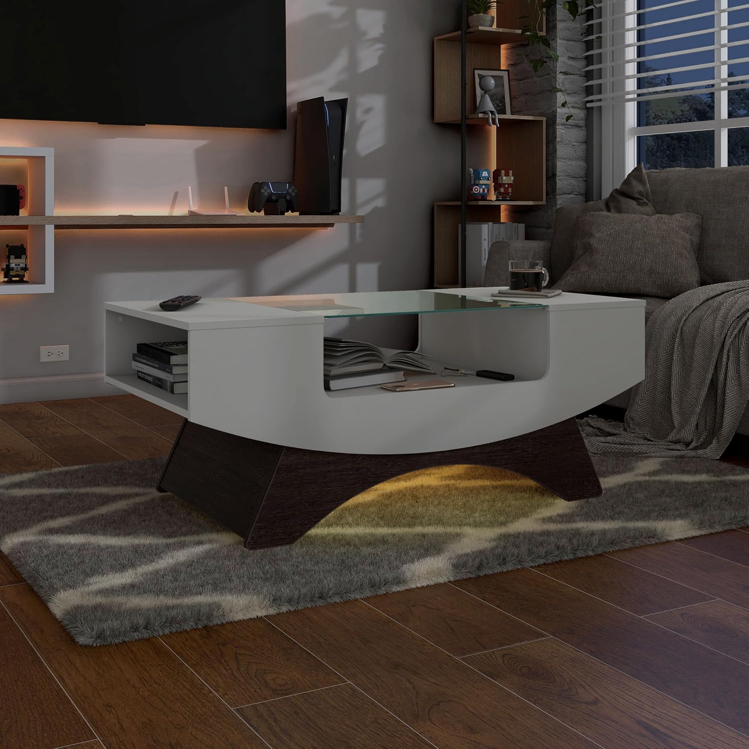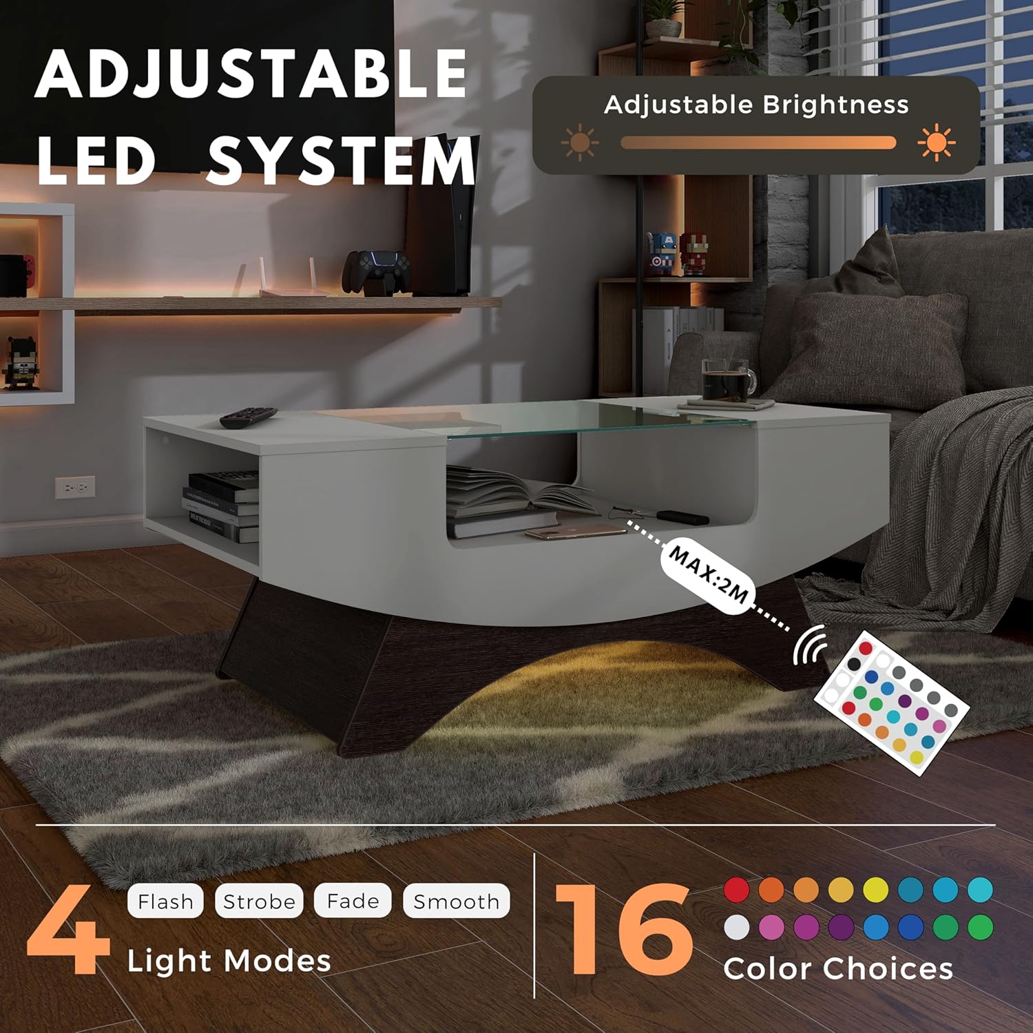 24/7 Shop at Home Kane Modern 39 Inch 16 Colors LED Coffee Table with Glass Top and Open Storage Shelf for Living Room, Home Office, White