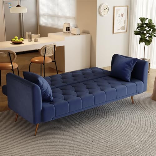 71'' Modern Velvet Futon Bed Loveseat, Convertible Folding Sleeper Couches with Adjustable Backrests and 2 Pillow, Lounge Sofa with Golden Chrome Legs, Green