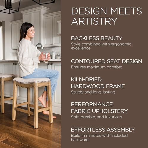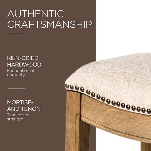 Maven Lane Adrien 26 Inch Counter Height Upholstered Backless Saddle Barstool in White Oak Finish with Natural Color Fabric Cushion Seat, Set of 2