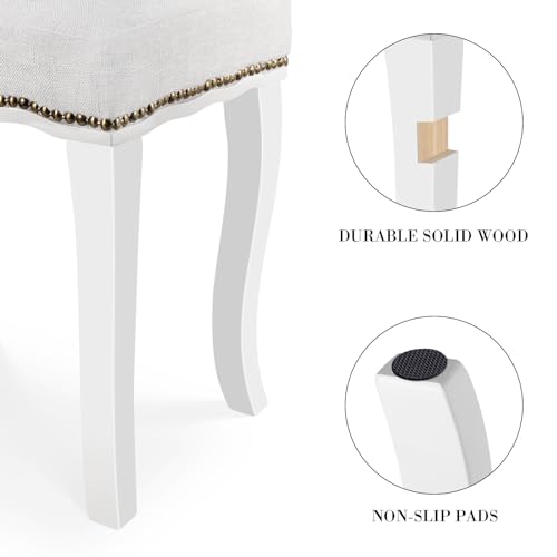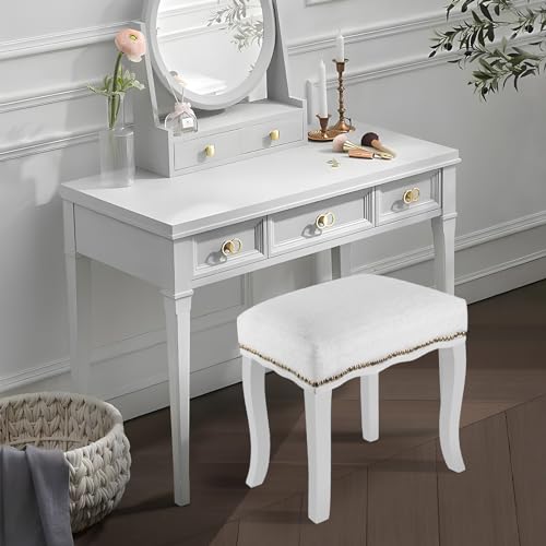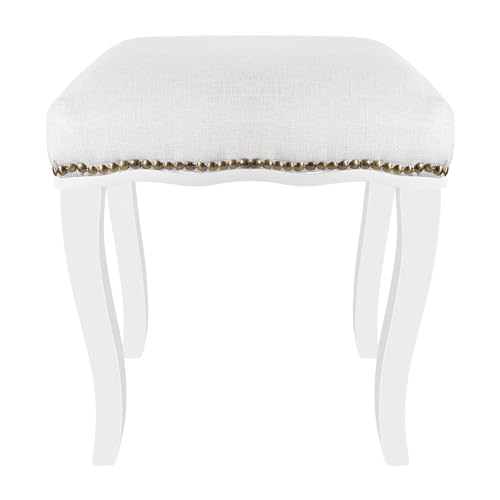 Vanity Stool with Cabriole Legs,Makeup Dressing Stool,Burnished Natural Oak Wood with Nail Head Trim (White)