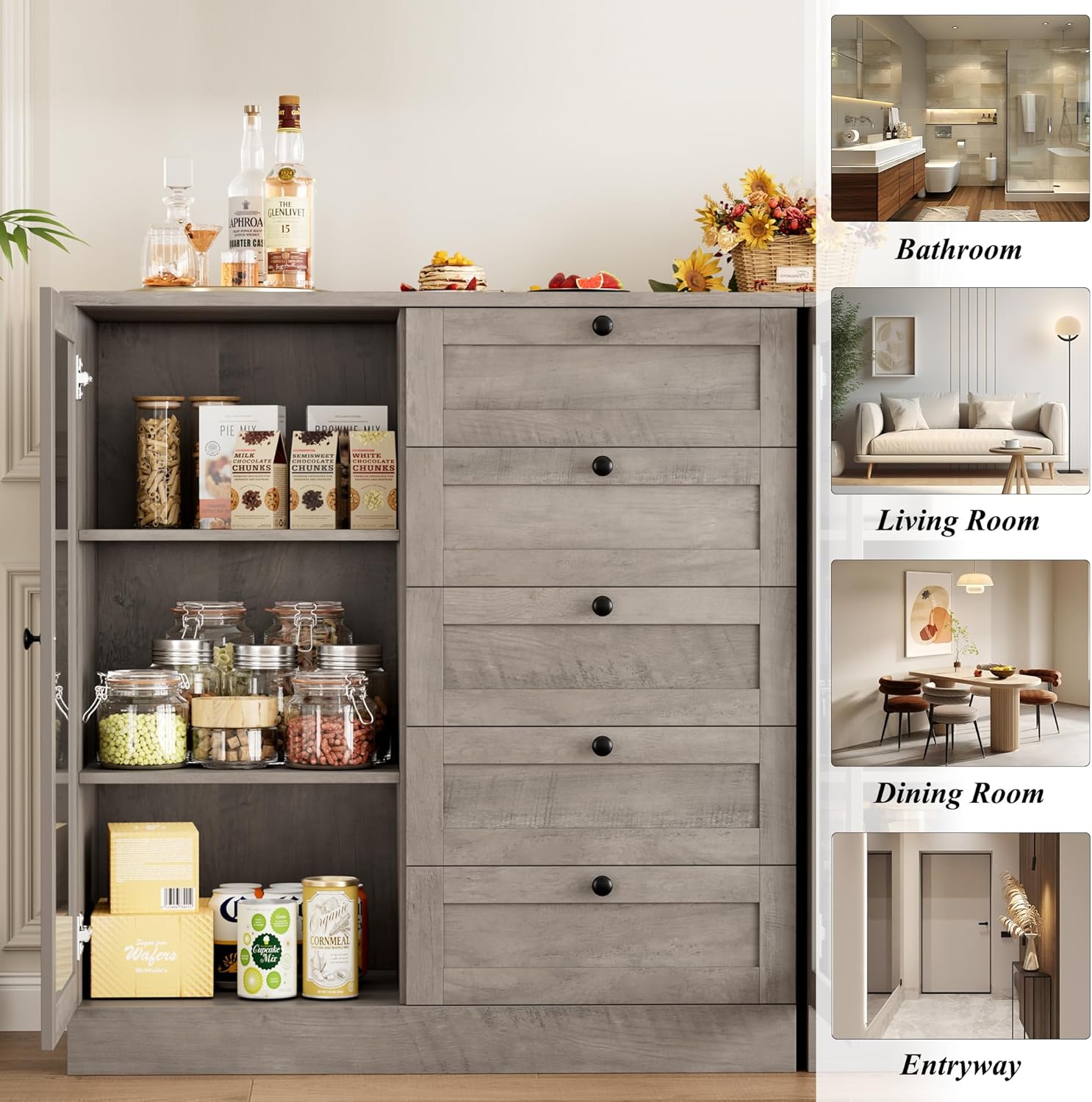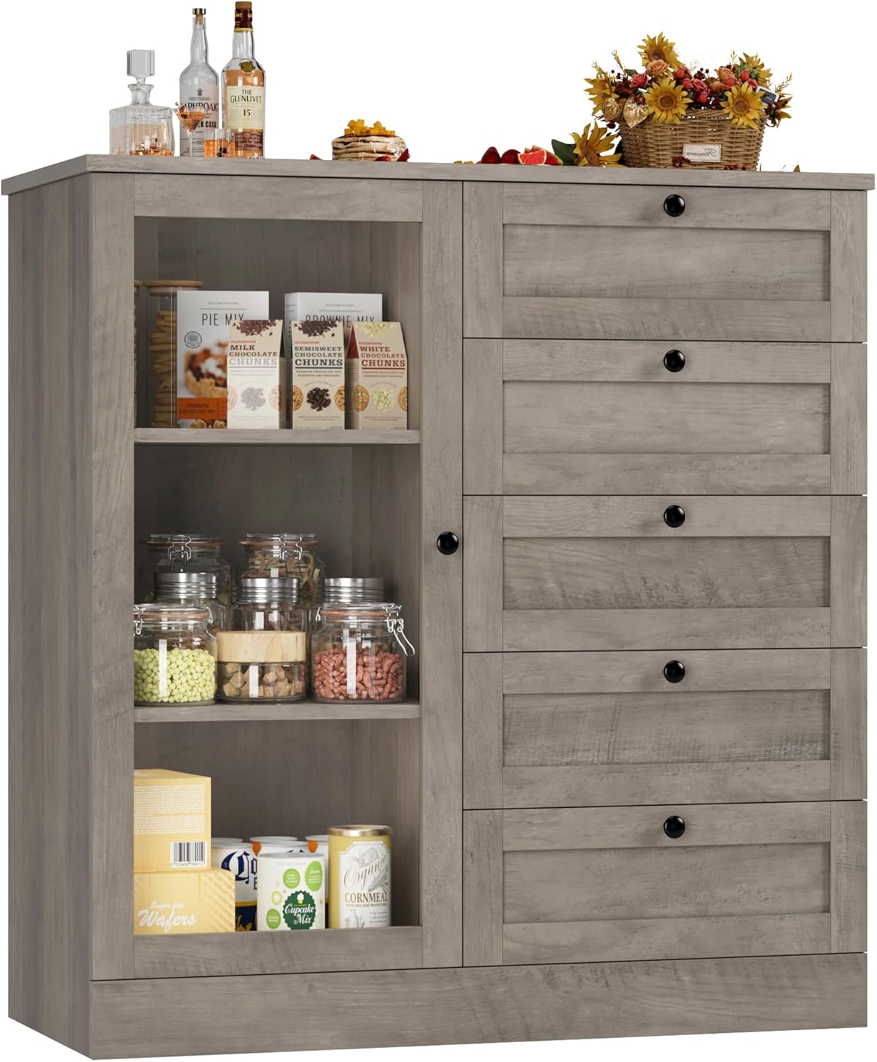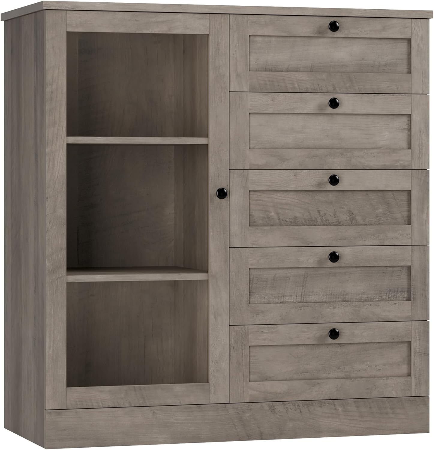 HOSTACK 5 Drawer Dresser with Door, Storage Cabinet with Drawers and Shelves, Wide Wood Dresser, Modern Chest of Drawers Organizers for Living Room, Kitchen, Hallway (Ash Grey, 2 PCS)