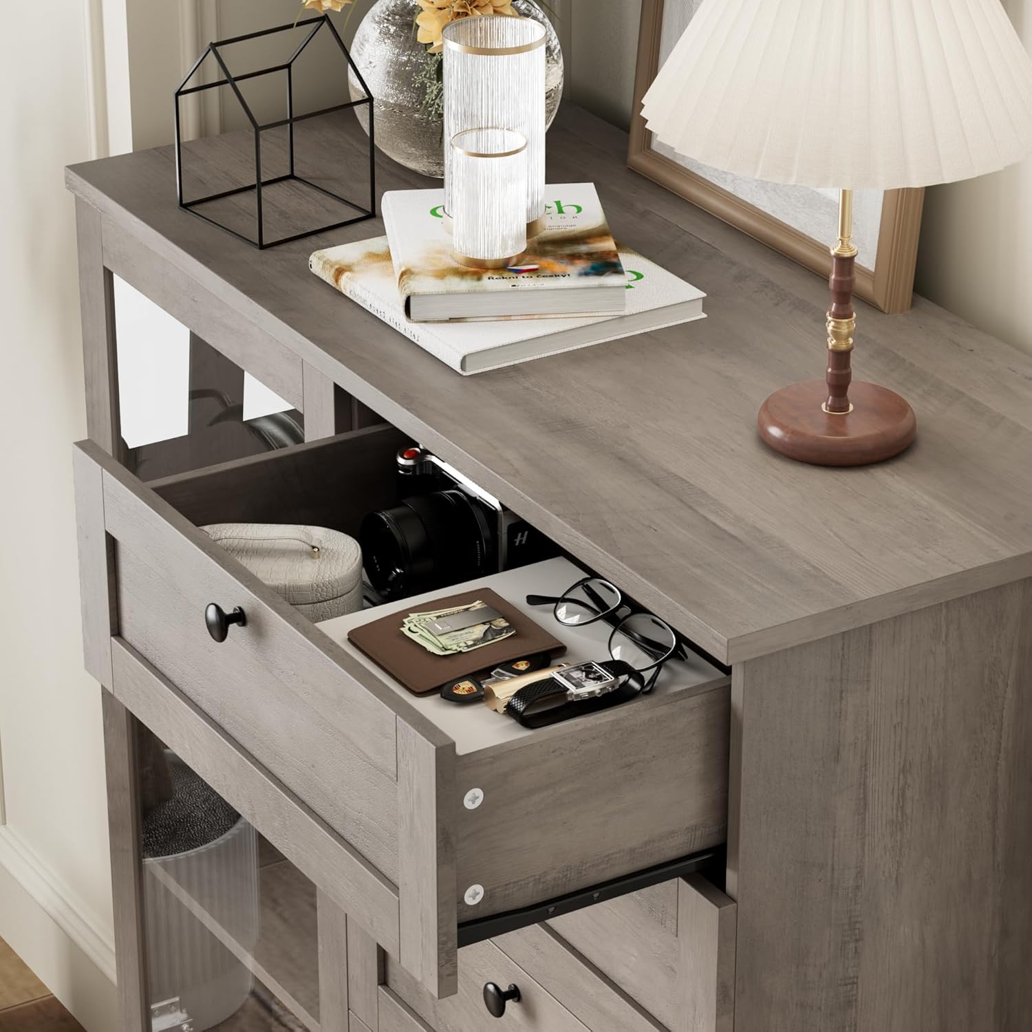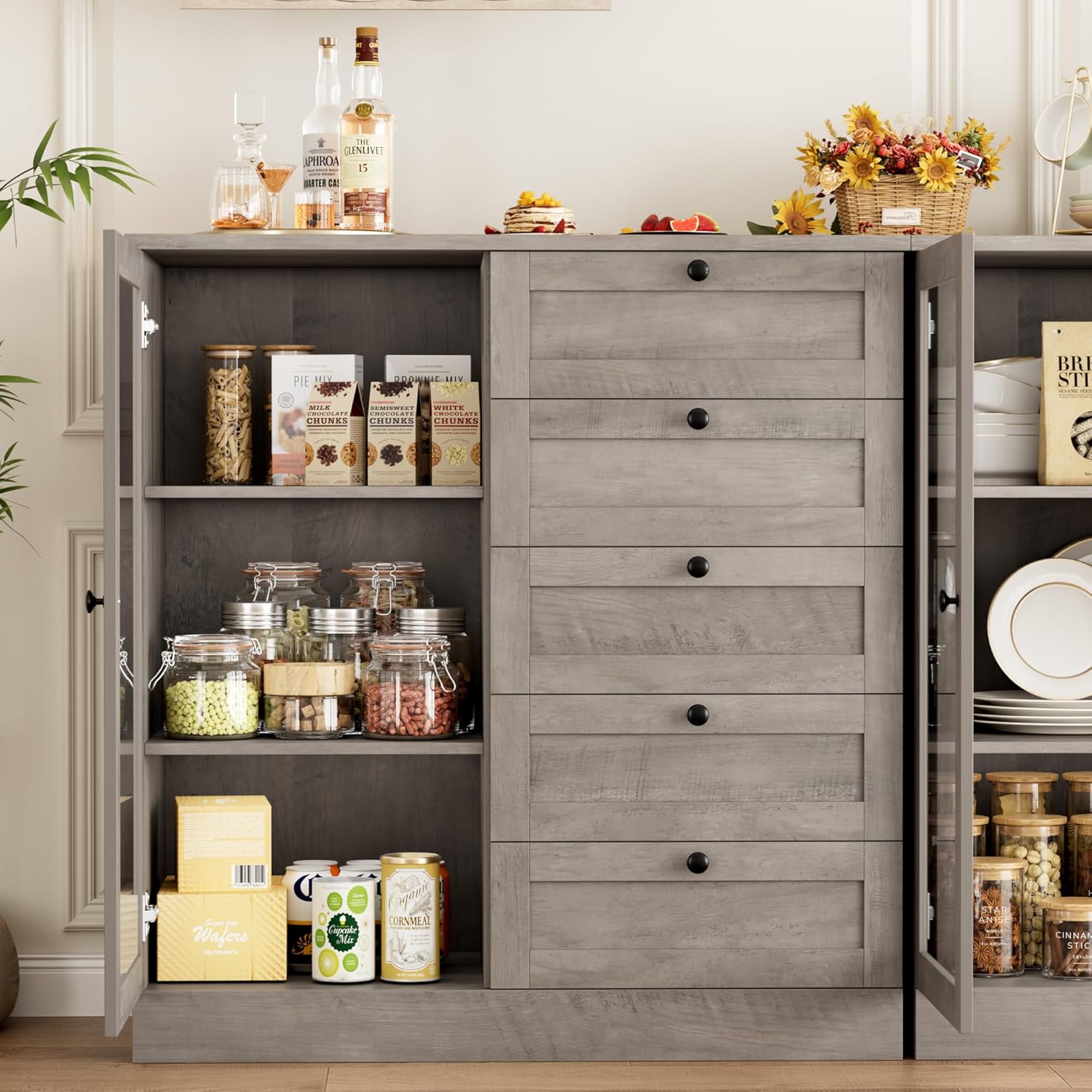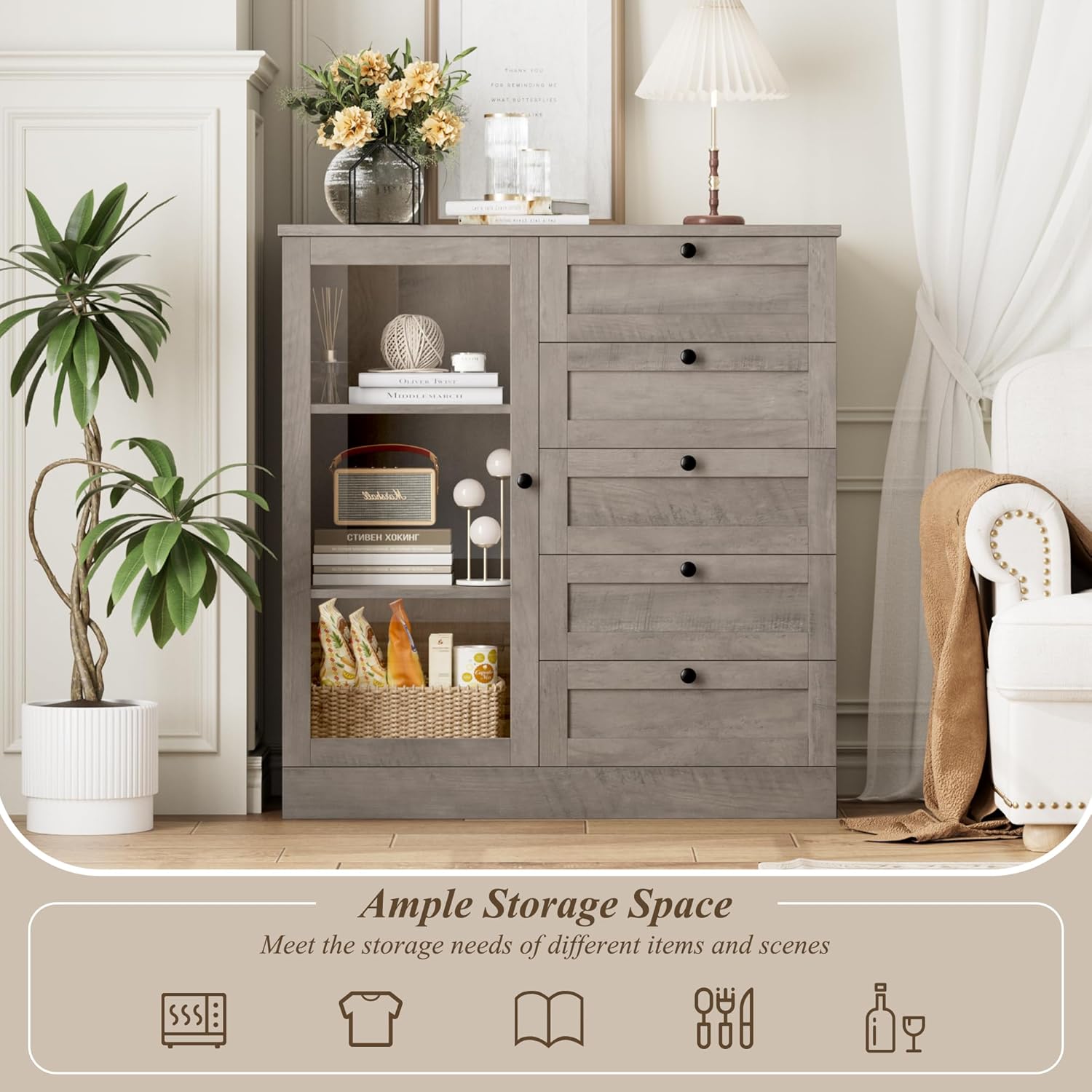HOSTACK 5 Drawer Dresser with Door, Storage Cabinet with Drawers and Shelves, Wide Wood Dresser, Modern Chest of Drawers Organizers for Living Room, Kitchen, Hallway (Ash Grey, 2 PCS)