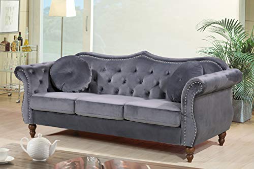 US Pride Furniture Anna Collection Modern Chesterfield Velvet Upholstered Sofa For Living Room with Elegant Rolled Arms, Solid Wood Frame & Accent Throw Pillows, Loveseat, Couch Set, Ash Grey