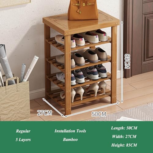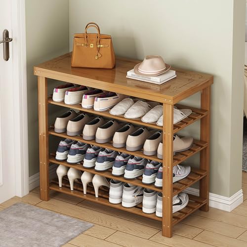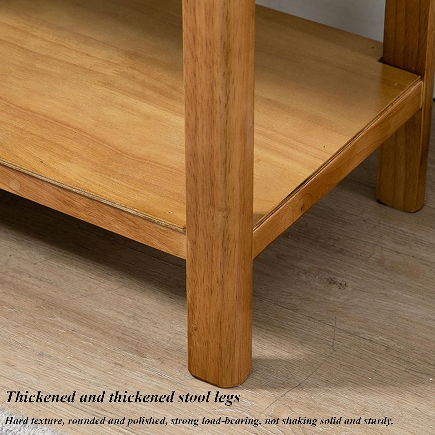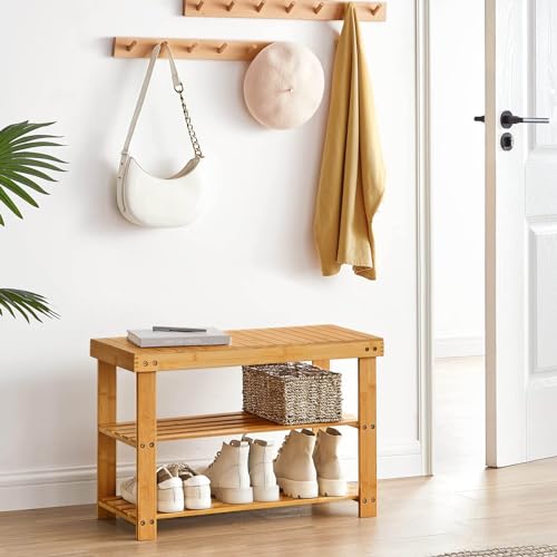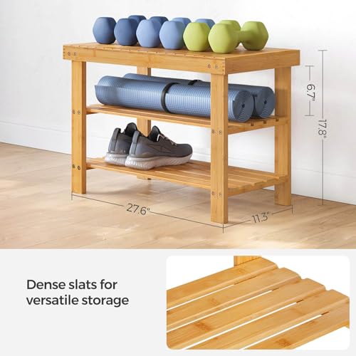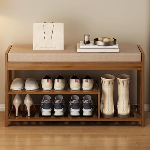 Shoe Bench 3-Tier Shoe Rack, Storage Entry Bench with Wood Seat, Rustic Foyer Bench for Hallway Front Door, Doorway, Living Room, Mudroom, Bamboo Frame