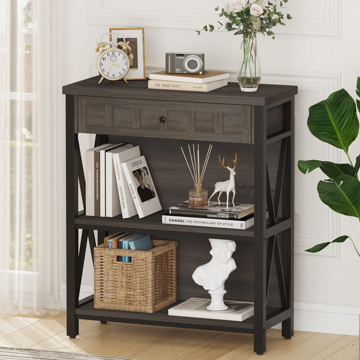FATORRI Shoe Bench with Storage and Rustic Bookshelf with Drawer (Walnut Brown)