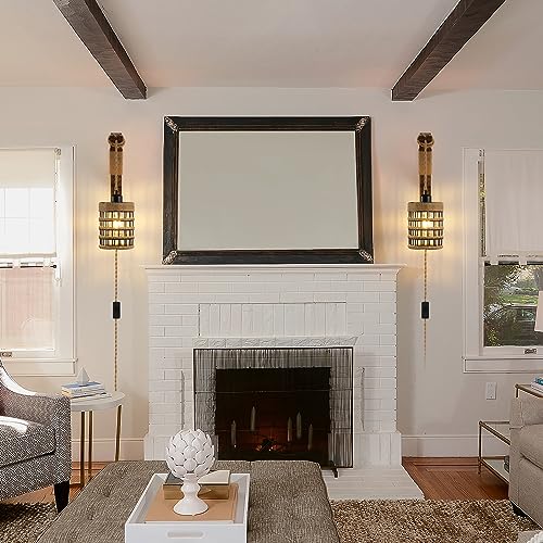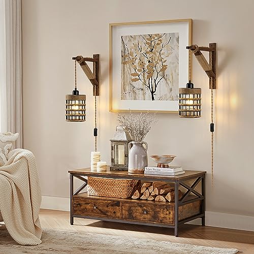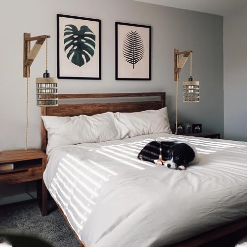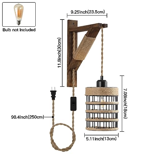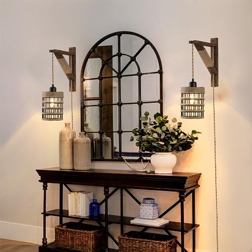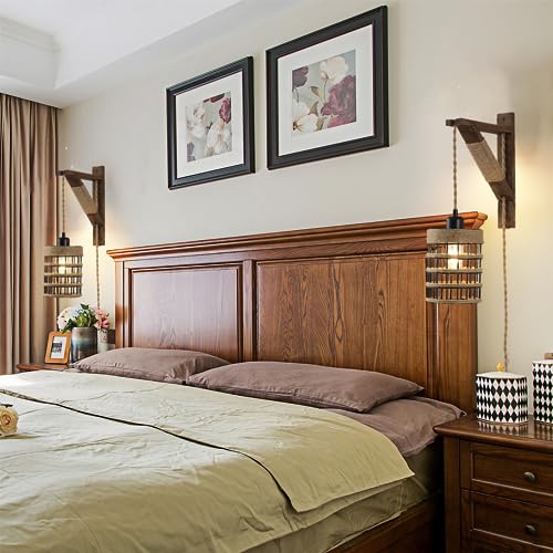 SEEBLEN Plug in Wall Sconces Set of 2,Farmhouse Hanging Lamps That Plug into Wall Outlet, Rustic Metal Cage Sconce with Wooden Bracket for Bedroom Living Room Headboard.