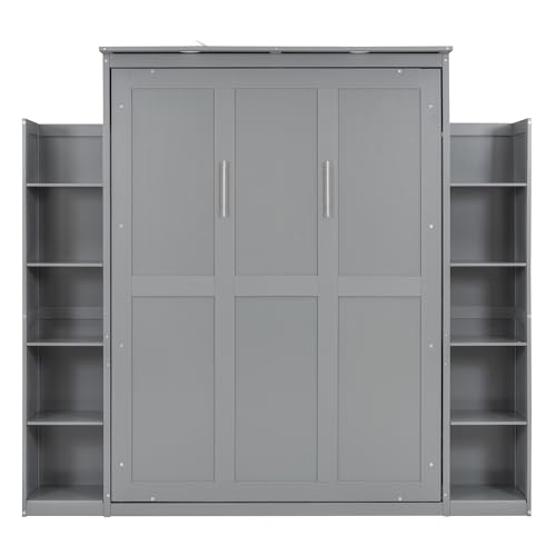 CITYLIGHT Full Size Murphy Bed with Storage Shelves and LED Lights, Easy Fold Wood Wall Bed, Space-saving Murphy Bed Cabinet for Guest Room Home Office, Grey