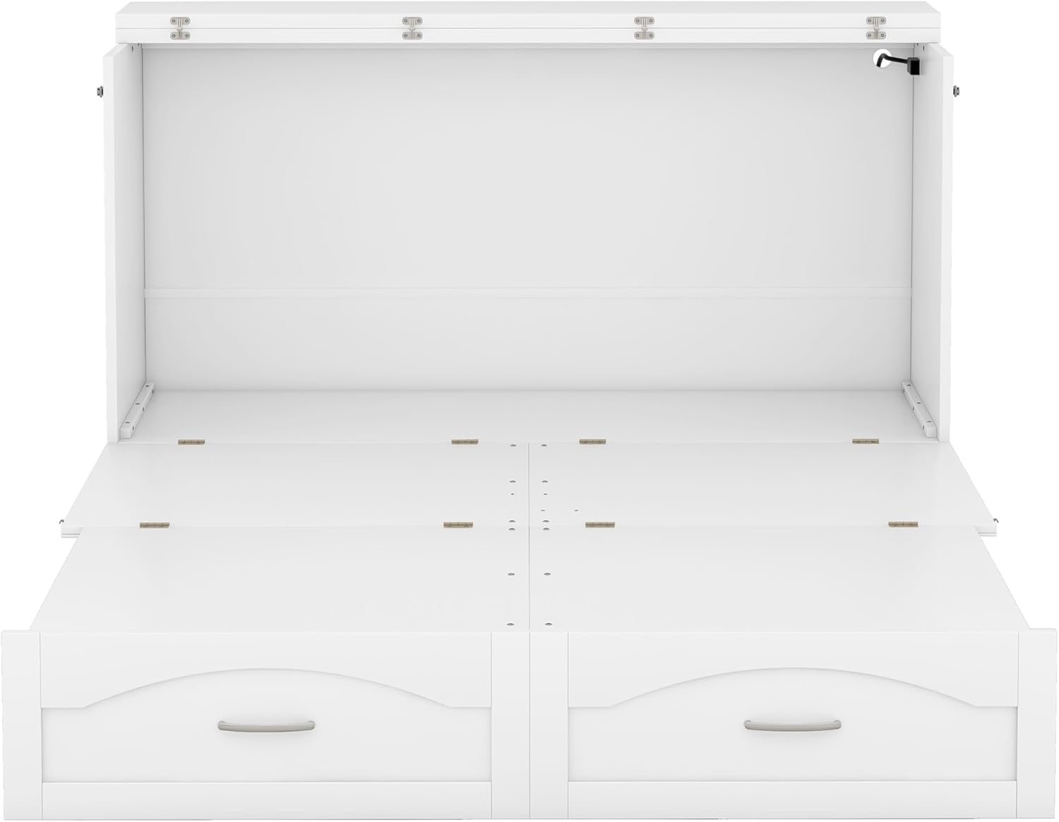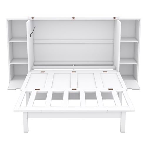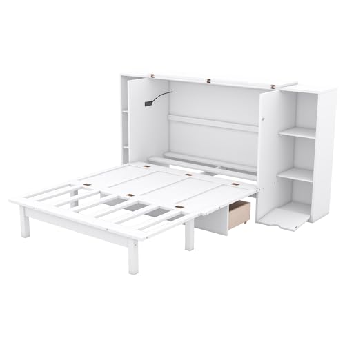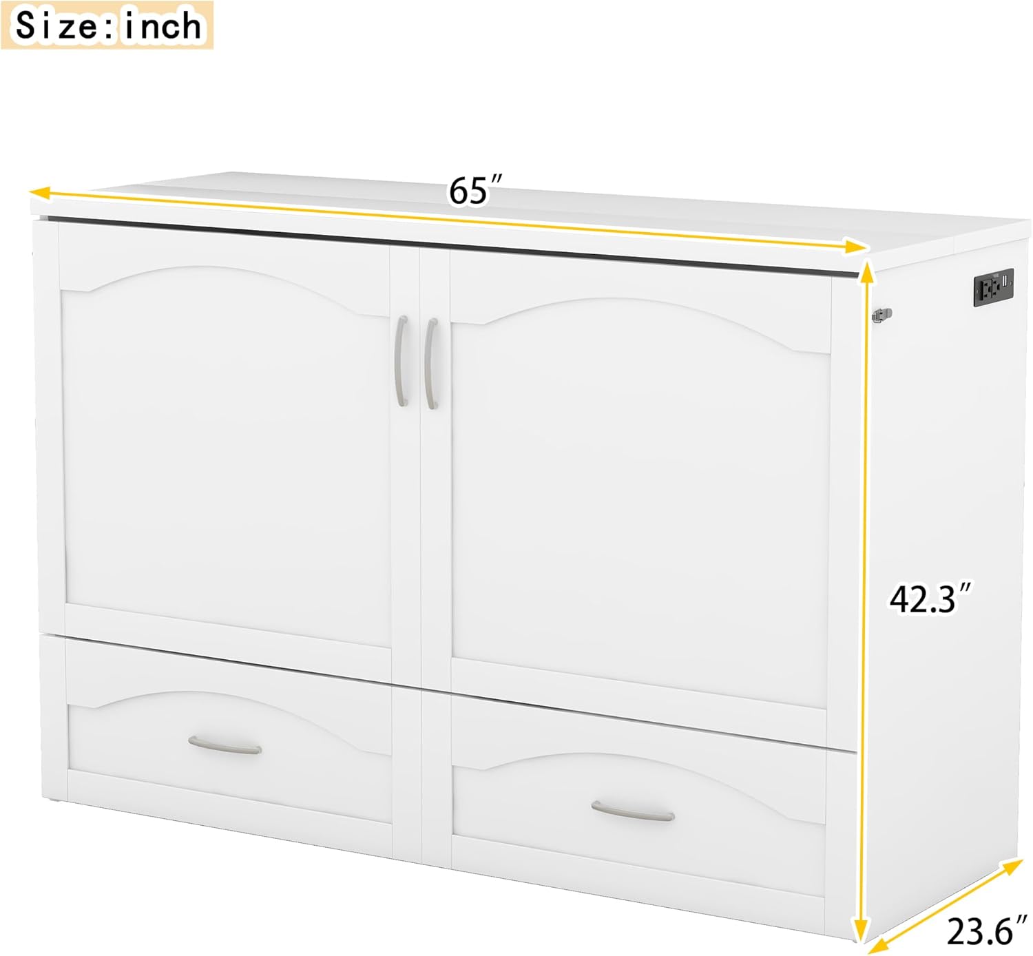 Full Size Murphy Bed Cabinet Bed with Charging Station and Drawer, Pull Out Murphy Bed Full, Space-saving Guest Cabinet Bed for Home Office Guest Room Bedroom White 76.4”L x 55.1”W x 40.9”H