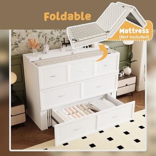 Queen Murphy Bed Chest with Mattress, Murphy Cabinet Bed with USB Charging Station, Murphy Bed Cube Cabinet with Large Storage Drawer Space Saving for Guest Room, Bed Room, Living Room