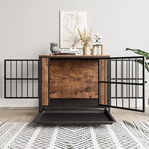 Dog Crate Furniture, Metal and Wooden Dog Crate, Dog Kennels with 3 Doors Indoor, Pet Puppy Crate End Table for Small/Medium/Large Dog, Heavy Duty Dog House, Rustic Black and Brown