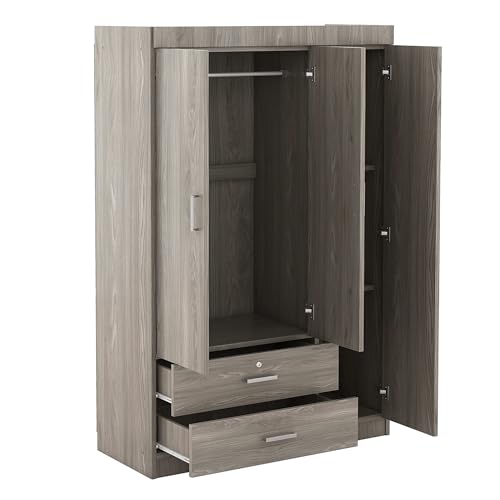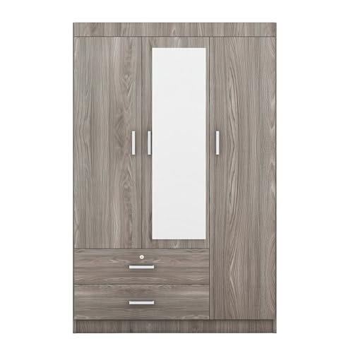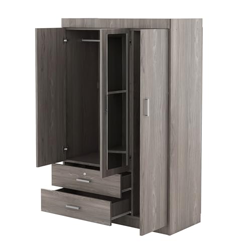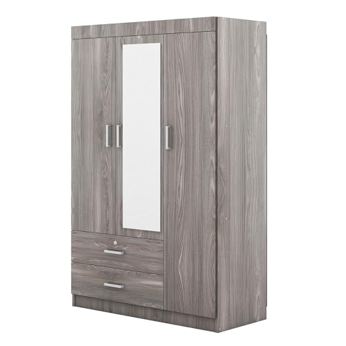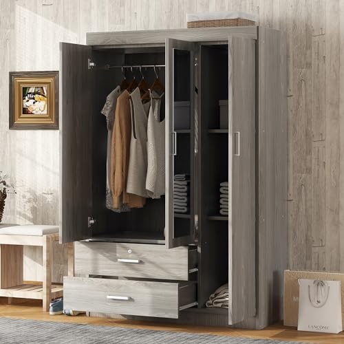 3 Doors Wardrobe Armoire with Mirror, Modern Wood Armoire Wardrobe Cabinet with Shelves & Hanging Rod, Bedroom Armoire Clothes Organizer (Gray-3G)