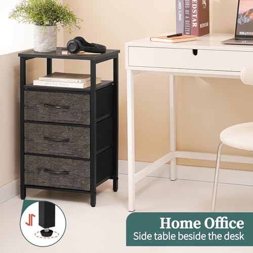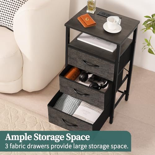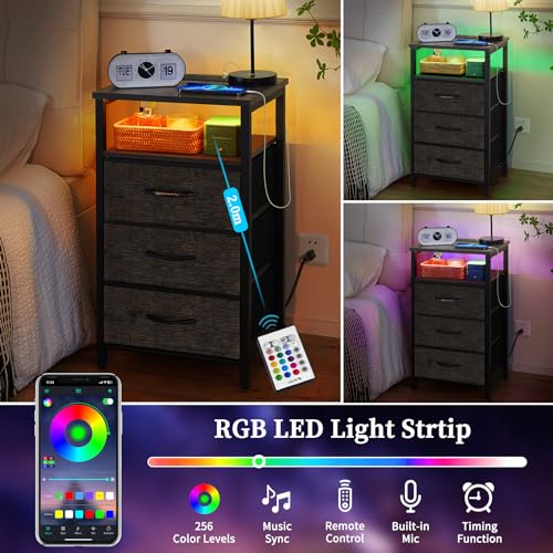 Yoobure Night Stand with Charging Station, 20 Colors LED Nightstand with USB Ports and Outlets, End Table with 3 Fabric Drawers and Storage Shelf, Bedside Tables Small Dresser for Small Space, Grey