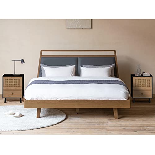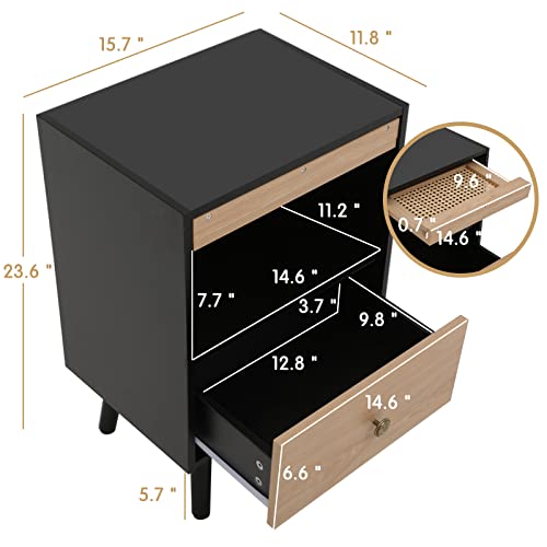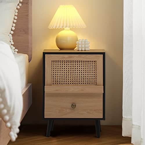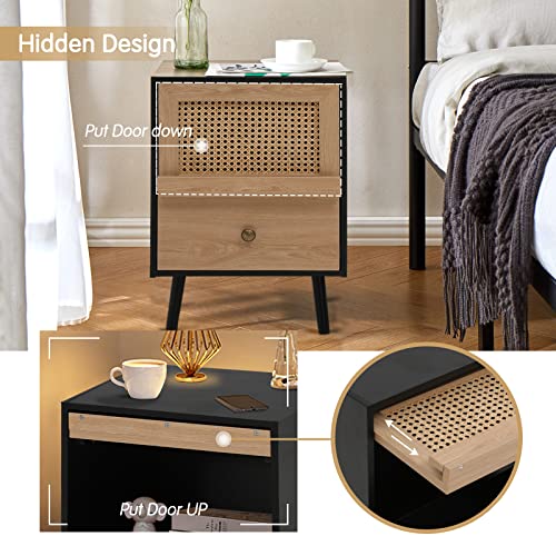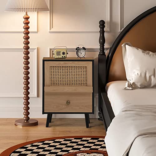 Anbuy Brown Rattan Nightstand Set of 2, Wooden End Side Table, Bedside Table with Door, Night Stands for Bedroom Living Room