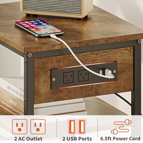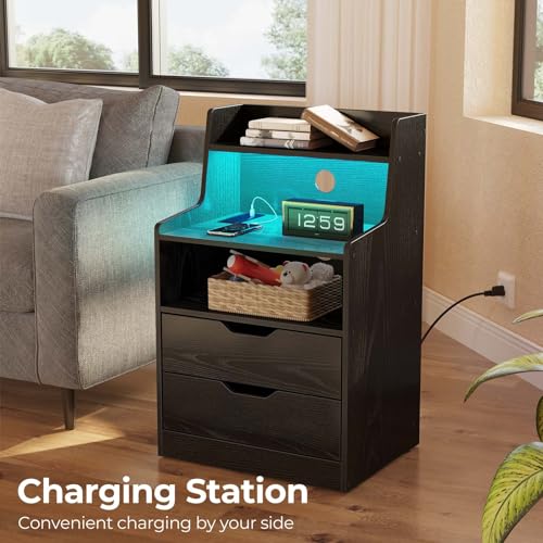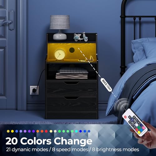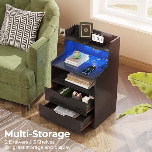 Rolanstar Nightstand with Charging Station and LED Lights, 2 AC and USB Power Outlets, Night Stand with 2 Drawers and Storage Shelves, Bedside Table for Bedroom - White