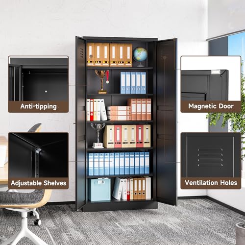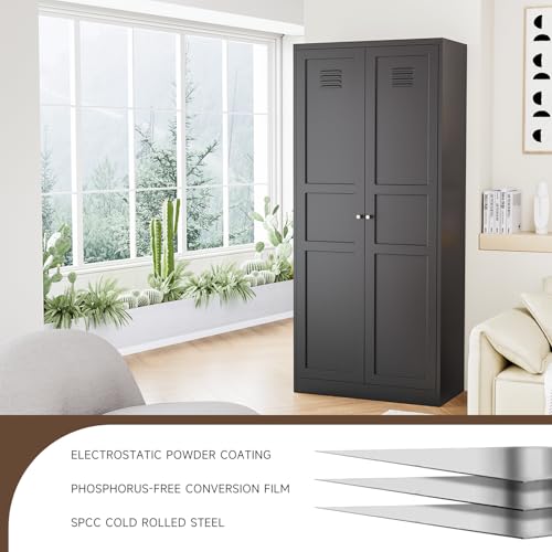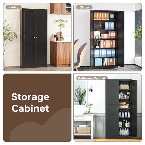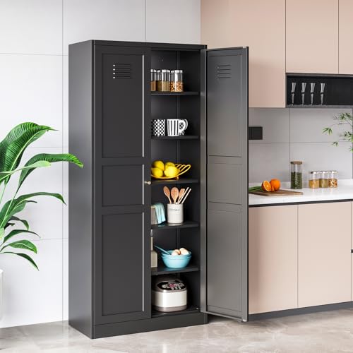 Kitchen Pantry Storage Cabinet, Metal Kitchen Pantry Cabinet with 2 Doors and Adjustable Shelves Kitchen Storage Cabinet for Dining Room,Living Room, Laundry(Black)